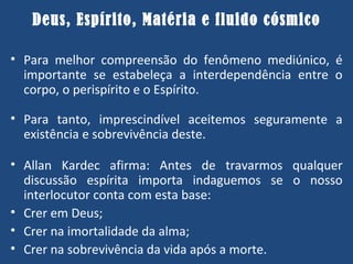 De acordo com o documento, o ser humano é constituído de Espírito, perispírito e corpo físico. O Espírito é o princípio inteligente imortal, o perispírito é o envoltório fluídico que permite a manifestação do Espírito no mundo físico e espiritual, e o corpo físico é o instrumento material do Espírito. O fluido cósmico desempenha um papel fundamental nessa relação, permitindo a ação do Espírito sobre a matéria.