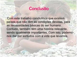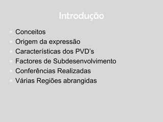 O documento trata do conceito de 'terceiro mundo', que se refere a países em vias de desenvolvimento enfrentando desafios em áreas como alimentação, saúde e educação. Ele explora a origem da expressão, características dos países em desenvolvimento, fatores de subdesenvolvimento e conferências importantes como a de Bandung e Belgrado. A conclusão ressalta a miséria persistente e a história significativa desses países.