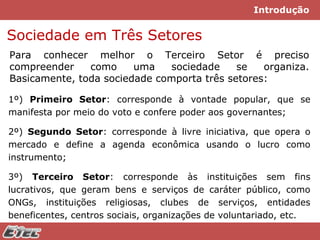 O documento discute o terceiro setor e a responsabilidade social. Apresenta uma definição de terceiro setor e descreve como a sociedade é organizada em três setores: primeiro setor corresponde ao governo, segundo setor às empresas privadas e terceiro setor às organizações sem fins lucrativos. Também discute a importância do terceiro setor para a sociedade e conceitos de responsabilidade social.