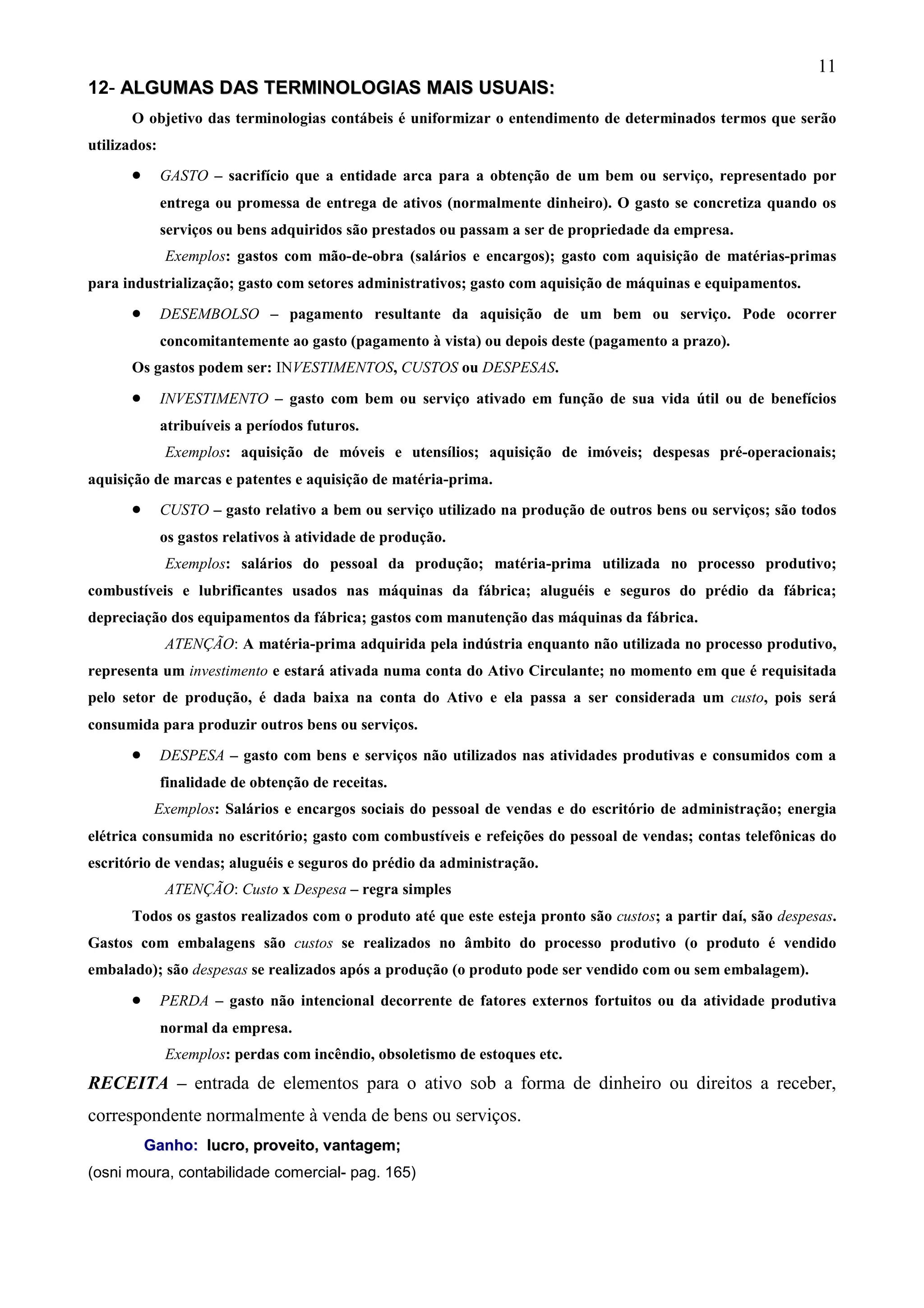 O documento define termos contábeis comuns como gasto, desembolso, investimento, custo, despesa e perda. Gastos podem ser investimentos, custos ou despesas. Investimentos são gastos com bens ou serviços ativados por sua vida útil. Custos são gastos relacionados à produção de outros bens ou serviços. Despesas são gastos não relacionados à produção e consumidos para gerar receita.