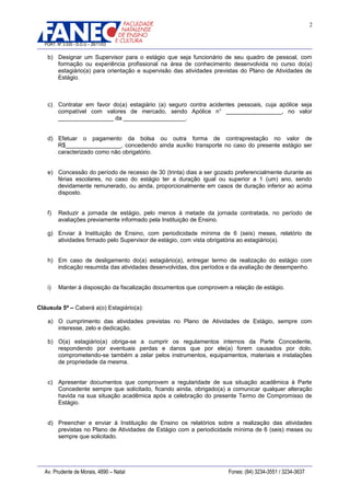 Este documento estabelece os termos de um acordo de estágio entre uma faculdade, uma empresa e um estudante. O acordo define as responsabilidades de cada parte, a duração do estágio, os horários, a bolsa de estágio e seguro, e o que acontece em caso de descumprimento do acordo.