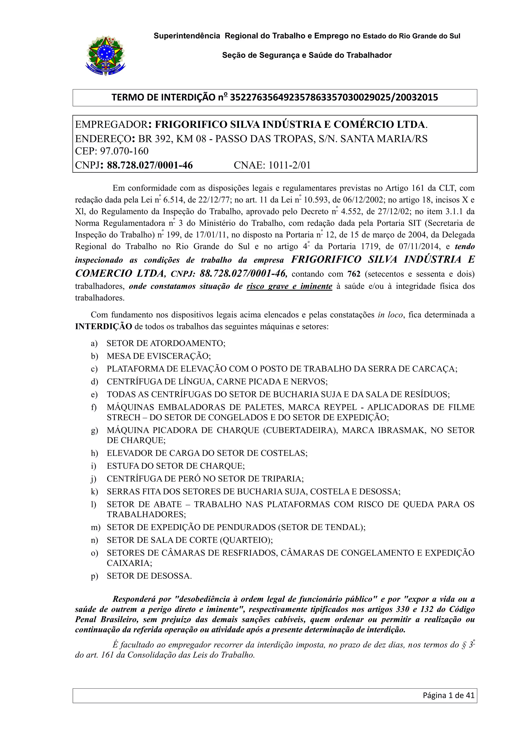 O documento descreve uma ação fiscal em uma indústria frigorífica que resultou na interdição de vários setores e máquinas por apresentarem risco grave e iminente à saúde dos trabalhadores. A fiscalização encontrou irregularidades técnicas em máquinas que expunham os funcionários a riscos como acidentes e doenças ocupacionais. A empresa pode recorrer da interdição e só poderá retomar as atividades após sanar as condições de risco apontadas no relatório técnico.