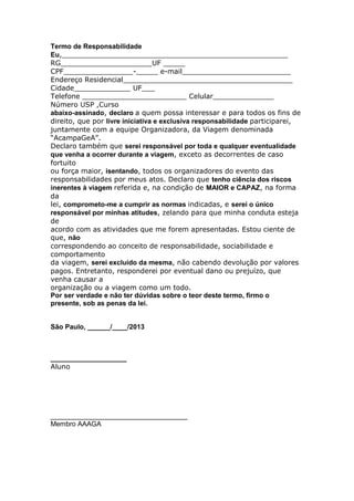 O documento é um termo de responsabilidade assinado por um aluno para participar de uma viagem organizada pela equipe AcampaGeA. Nele, o aluno declara assumir toda responsabilidade por eventuais incidentes durante a viagem, exceto casos fortuitos ou força maior. Ele também se compromete a cumprir as normas estabelecidas e pode ser excluído da viagem se não demonstrar responsabilidade, sociabilidade e comportamento adequado.
