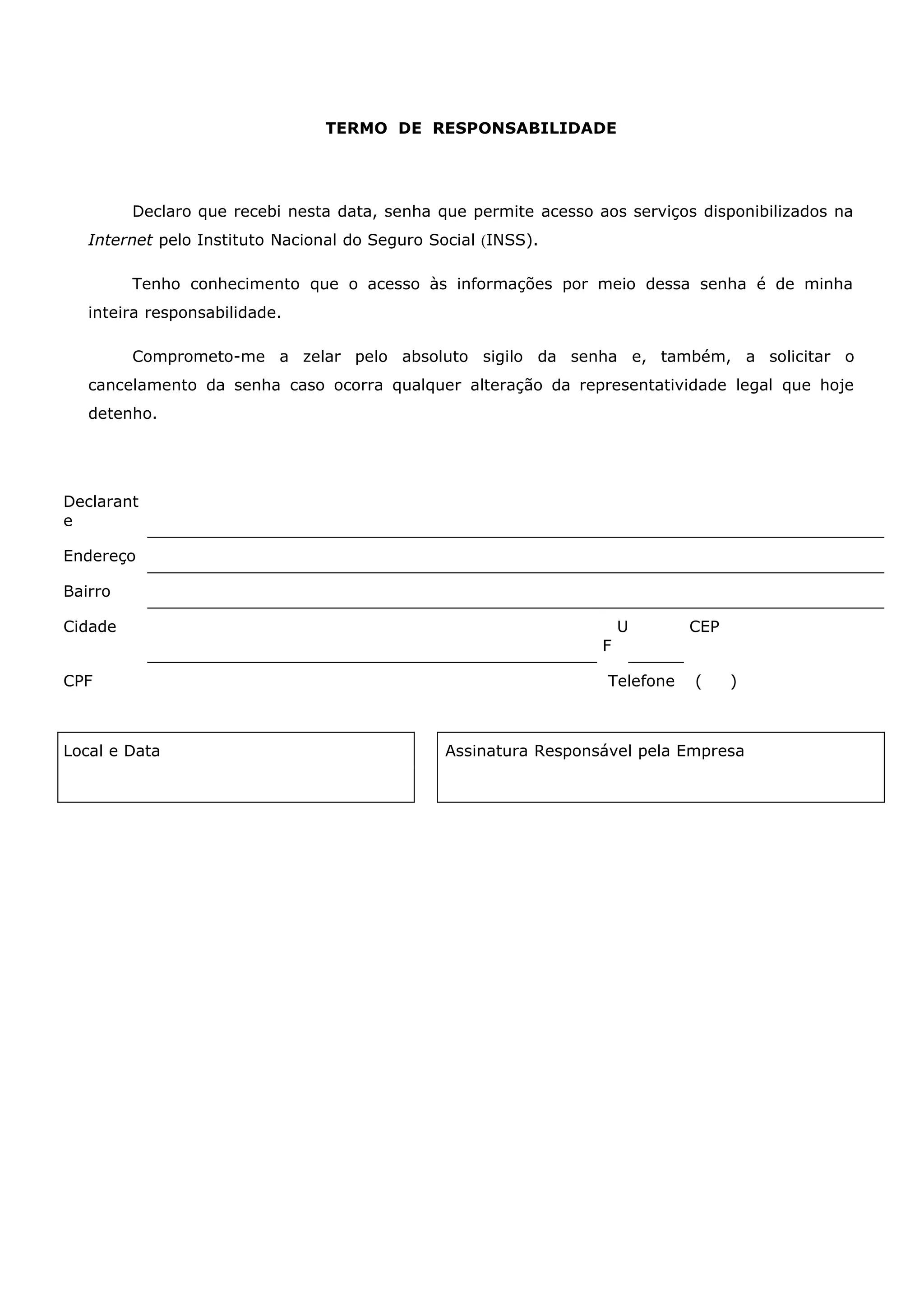 O documento é um termo de responsabilidade no qual o declarante recebe uma senha para acessar serviços do INSS, sendo responsável pelo sigilo da senha e solicitando o cancelamento caso haja alteração na representatividade legal. O declarante fornece seus dados pessoais e assina o termo.