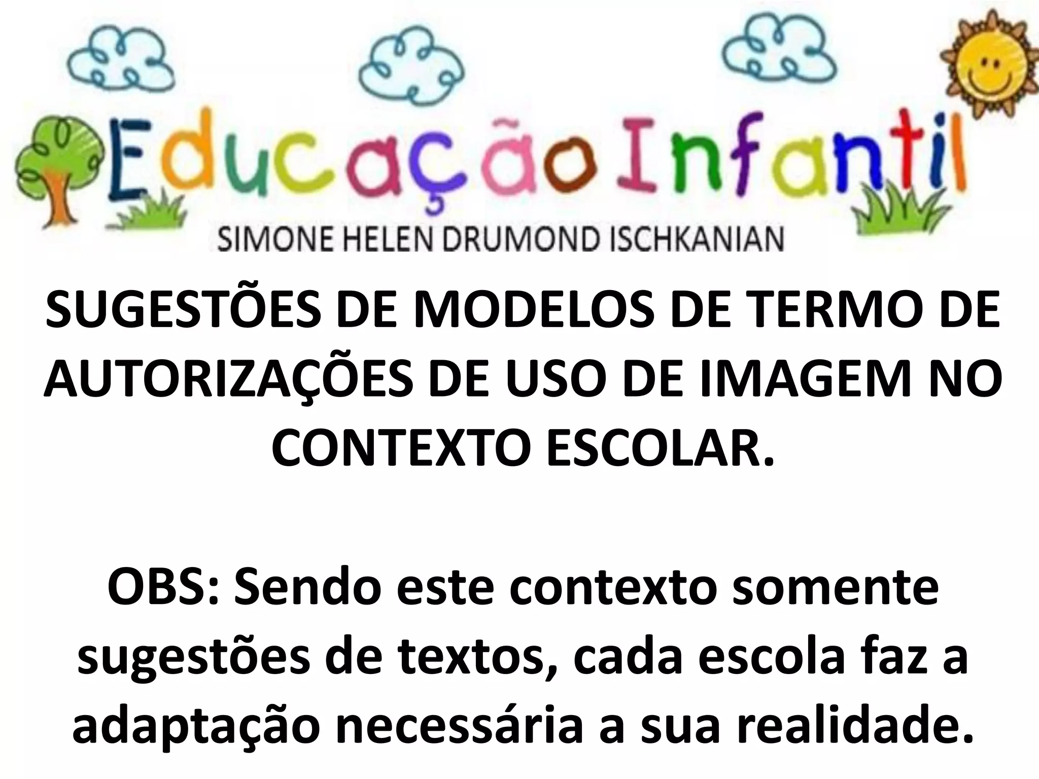 O documento fornece sugestões de modelos de termos de autorização para uso de imagens em contexto escolar, incluindo informações sobre o responsável pela criança, a escola, o professor e a autorização para diversos fins educacionais e divulgação.