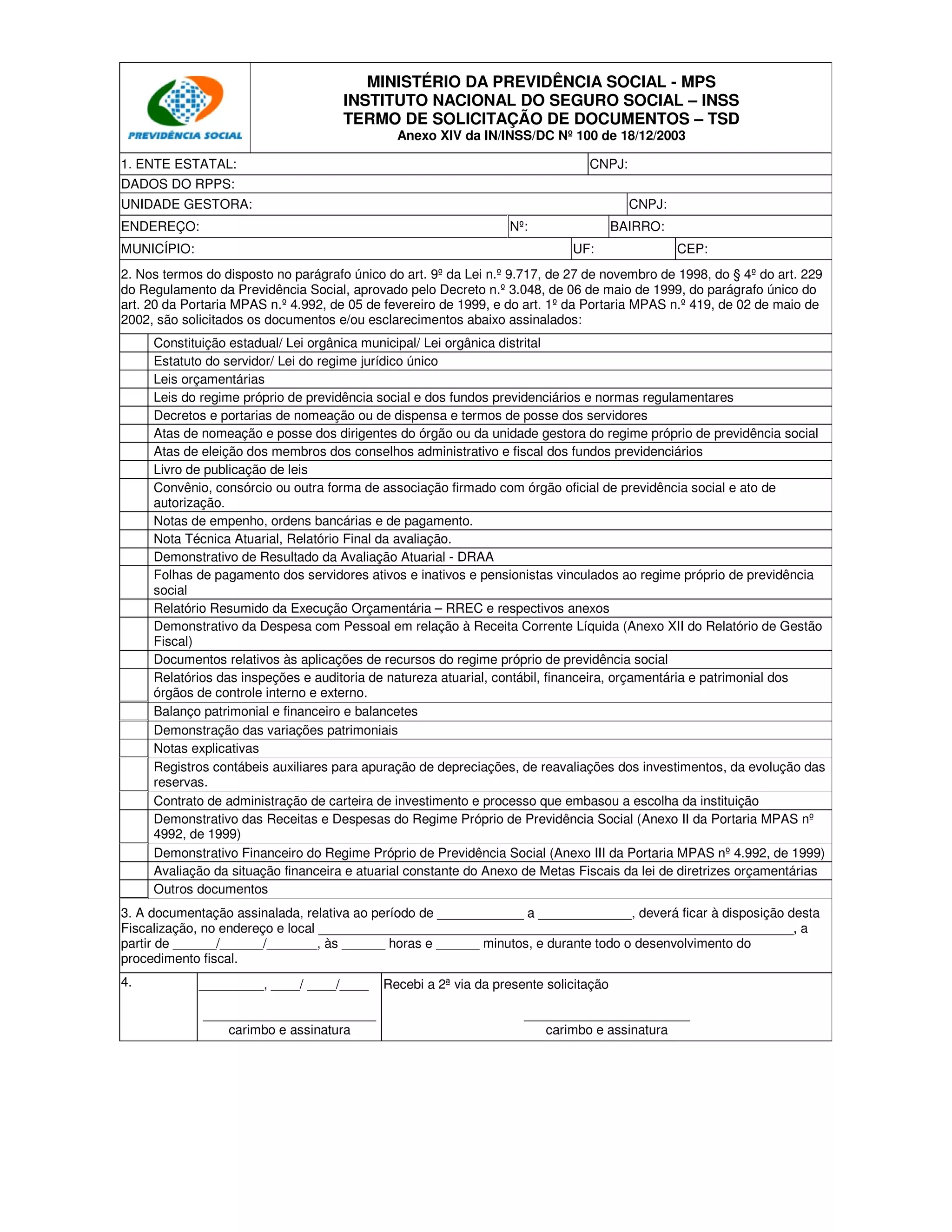 O documento solicita documentos e informações de um ente estatal sobre seu regime próprio de previdência social (RPPS) para fins de fiscalização. Ele requer documentos como leis, decretos, atas, demonstrações financeiras, relatórios atuariais e de auditoria, registros contábeis e contratos referentes ao período de ___ a ___. Os documentos devem ficar à disposição no endereço fornecido a partir da data indicada.
