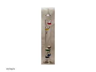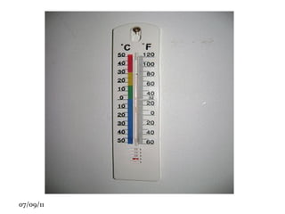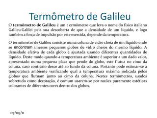 O documento discute termologia, o estudo do calor e da temperatura. Explica que a termologia estuda como o calor é transferido entre corpos e as características dos processos de transferência de calor, como convecção, irradiação e condução. Também descreve os termômetros e as escalas de temperatura, incluindo os pontos fixos de fusão do gelo e ebulição da água usados para graduar as escalas Celsius, Fahrenheit e Kelvin.