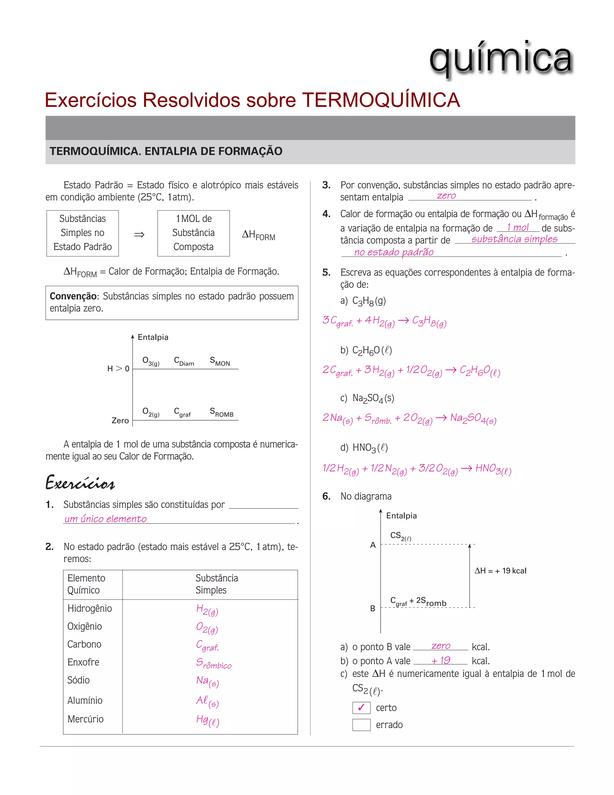 1) O documento discute termos químicos como entalpia de formação, entalpia de combustão e lei de Hess para calcular variações de entalpia em reações químicas.