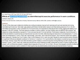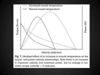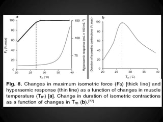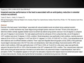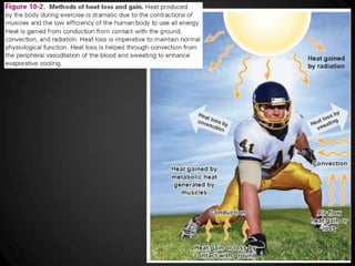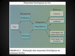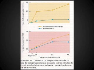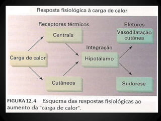 O documento discute os mecanismos de termorregulação no corpo humano, incluindo a produção e perda de calor e como esses processos são regulados. Ele também aborda como a termorregulação é afetada pelo exercício físico e como fatores como composição corporal e aptidão física influenciam a tolerância ao calor durante o exercício.