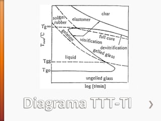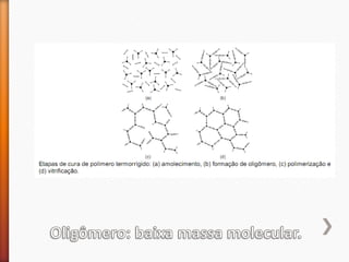 O documento discute os termoplásticos e termorrígidos, resumindo suas principais características e aplicações. É mencionado que os primeiros termofíxos surgiram em 1909, como o baquelite, e que eles se diferenciam dos termoplásticos pela impossibilidade de fusão e dissolução, alta dureza e resistência térmica.