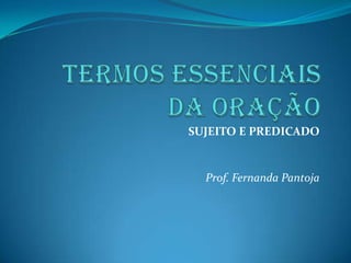 O documento define sujeito e predicado como termos essenciais das orações. O sujeito é tudo aquilo que pratica uma ação, sofre uma ação ou apresenta um estado. Existem vários tipos de sujeito como sujeito simples, composto e desinencial. O predicado é tudo que se declara sobre o sujeito e também possui diferentes tipos como predicado verbal, nominal e verbo nominal.