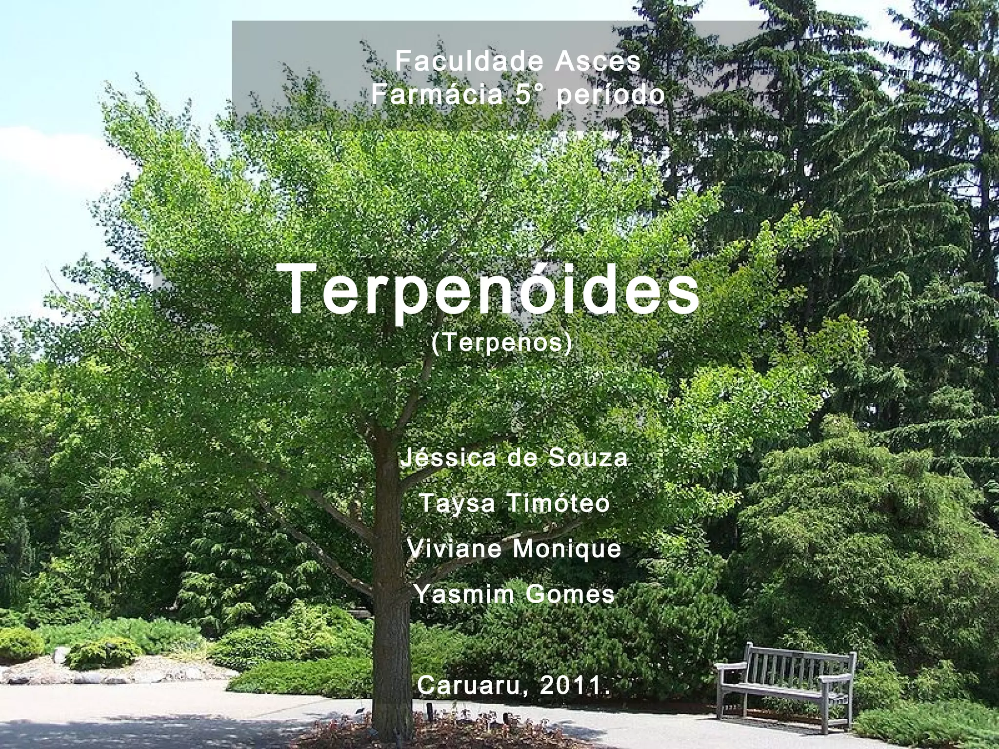 O documento discute terpenos e terpenóides, incluindo sua estrutura química, classificações, funções e aplicações. É explicado que terpenos são compostos derivados da terbentina e terpenóides contêm grupos funcionais adicionais. Vários exemplos de onde esses compostos são encontrados e suas ações farmacológicas são apresentados.
