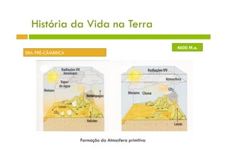 O documento descreve a história da vida na Terra, começando pela Era Pré-Cambrica há 4600 milhões de anos com a formação da atmosfera e oceanos primitivos e os primeiros seres unicelulares. Apresenta depois as Eras Paleozóica, Mesozóica e Cenozóica, destacando os principais eventos como a colonização da terra, o domínio dos dinossauros, a extinção em massa do Cretáceo e o surgimento dos humanos.
