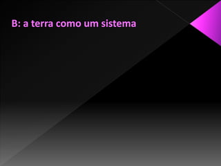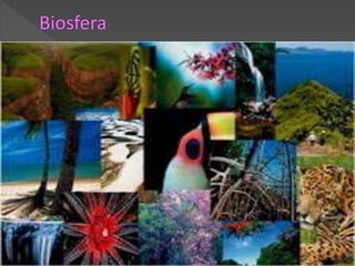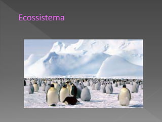 O documento descreve os componentes de um ecossistema, incluindo fatores abióticos como temperatura e água, e fatores bióticos como as relações entre organismos. Define biomas como grandes unidades ecológicas caracterizadas pela vegetação dominante sob condições climáticas semelhantes. Explica que um ecossistema é formado por um meio físico-químico natural e organismos que interagem em um ciclo equilibrado de produção, decomposição e consumo.