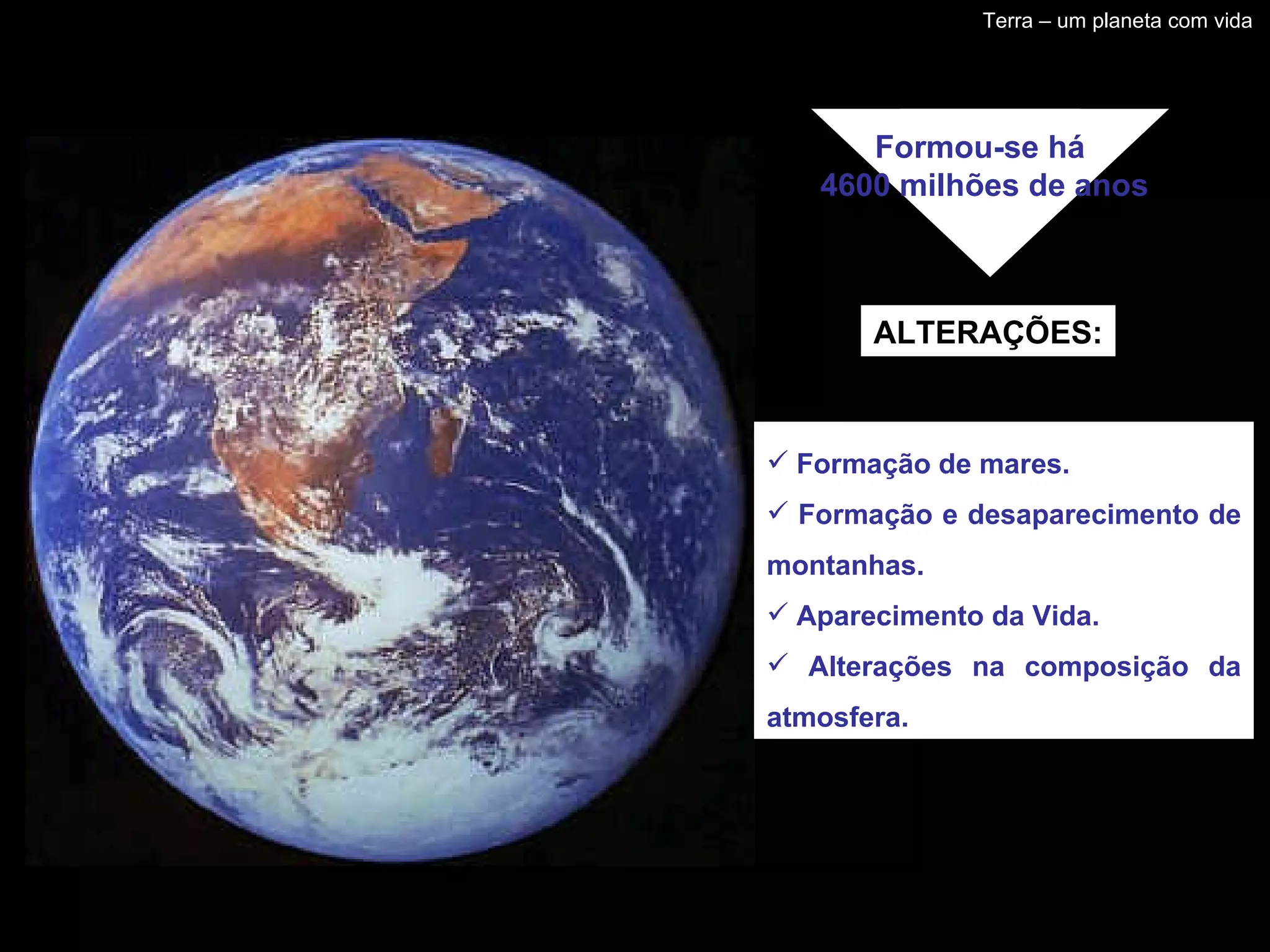 1) O documento descreve a evolução da Terra e da vida ao longo do tempo, desde a formação do planeta há 4,6 bilhões de anos até a atmosfera e biodiversidade atuais.