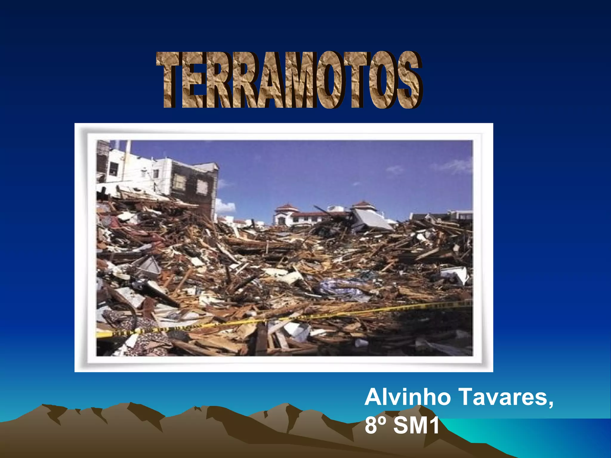 Terramotos são vibrações na crosta terrestre causadas pela movimentação das placas tectônicas. Podem destruir casas e infraestrutura, causar mortes e prejuízos. A escala de Richter mede a intensidade dos terramotos. Embora não se possa prever terramotos, tsunamis podem ser alertados.