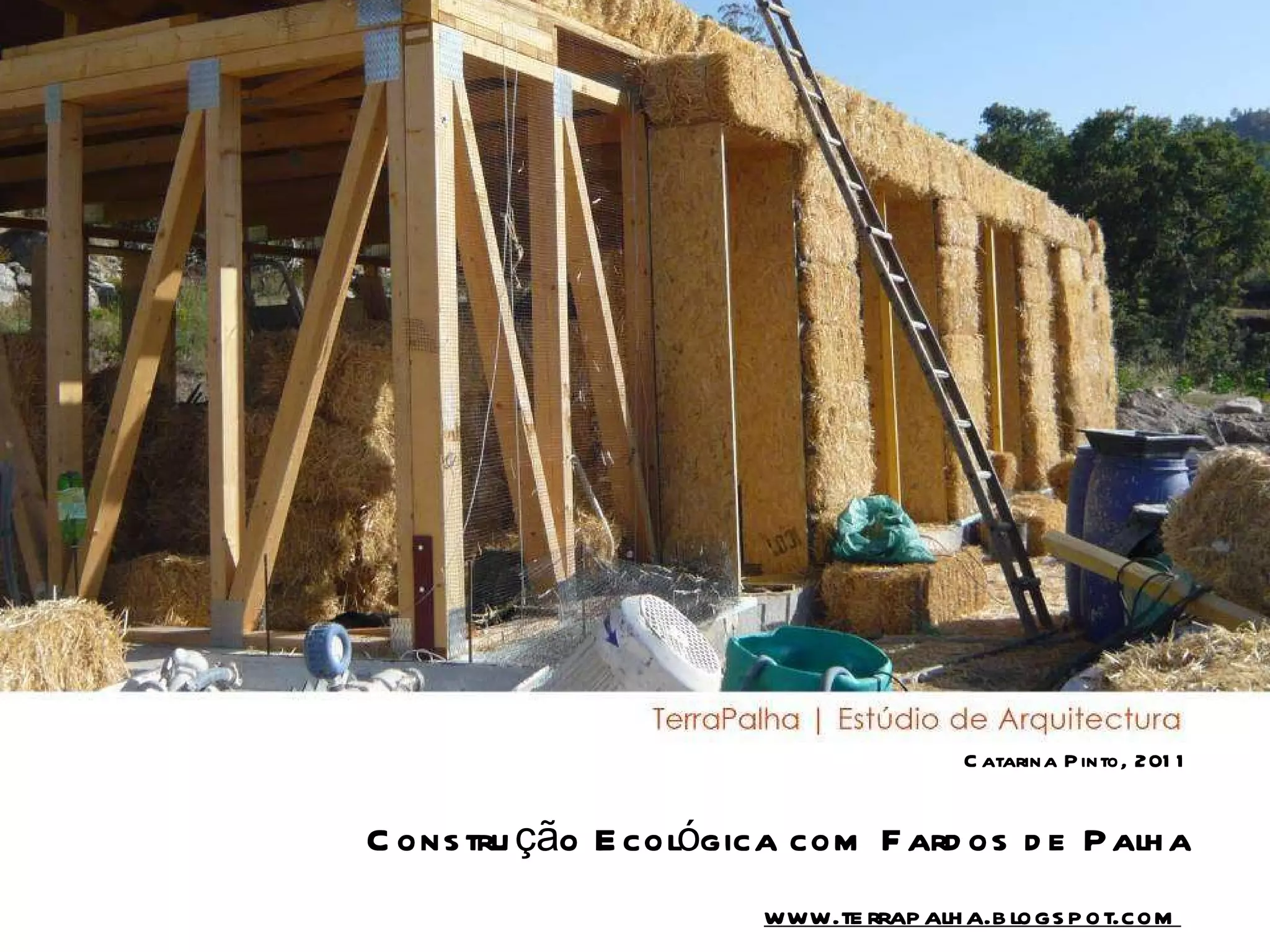 O documento descreve as vantagens da construção com fardos de palha, incluindo ser saudável, resistente, confortável, de baixo impacto ambiental e reduzir o consumo de energia. Detalha a técnica de empilhamento dos fardos e fornece exemplos de projetos na Europa que usam esta técnica.