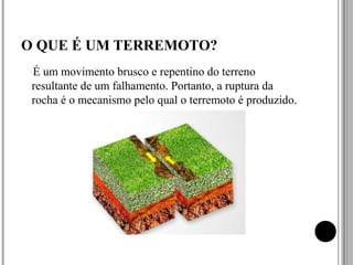 O poema de Mário Quintana expressa uma sensação interna de um terremoto iminente, apesar da paz exterior. O documento então explica o que é um terremoto, como é produzido pela ruptura de rochas em falhas geológicas, e descreve a magnitude e os tipos de ondas sísmicas.