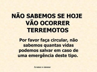 O documento fornece instruções sobre como sobreviver a um terremoto, recomendando que as pessoas fiquem em posição fetal ao lado de objetos grandes que possam criar "triângulos de vida" - espaços vazios protegidos do desabamento. O autor afirma ter experiência em mais de 60 países e 875 prédios desabados, e que um filme produzido na Turquia comprova a eficácia desta técnica.