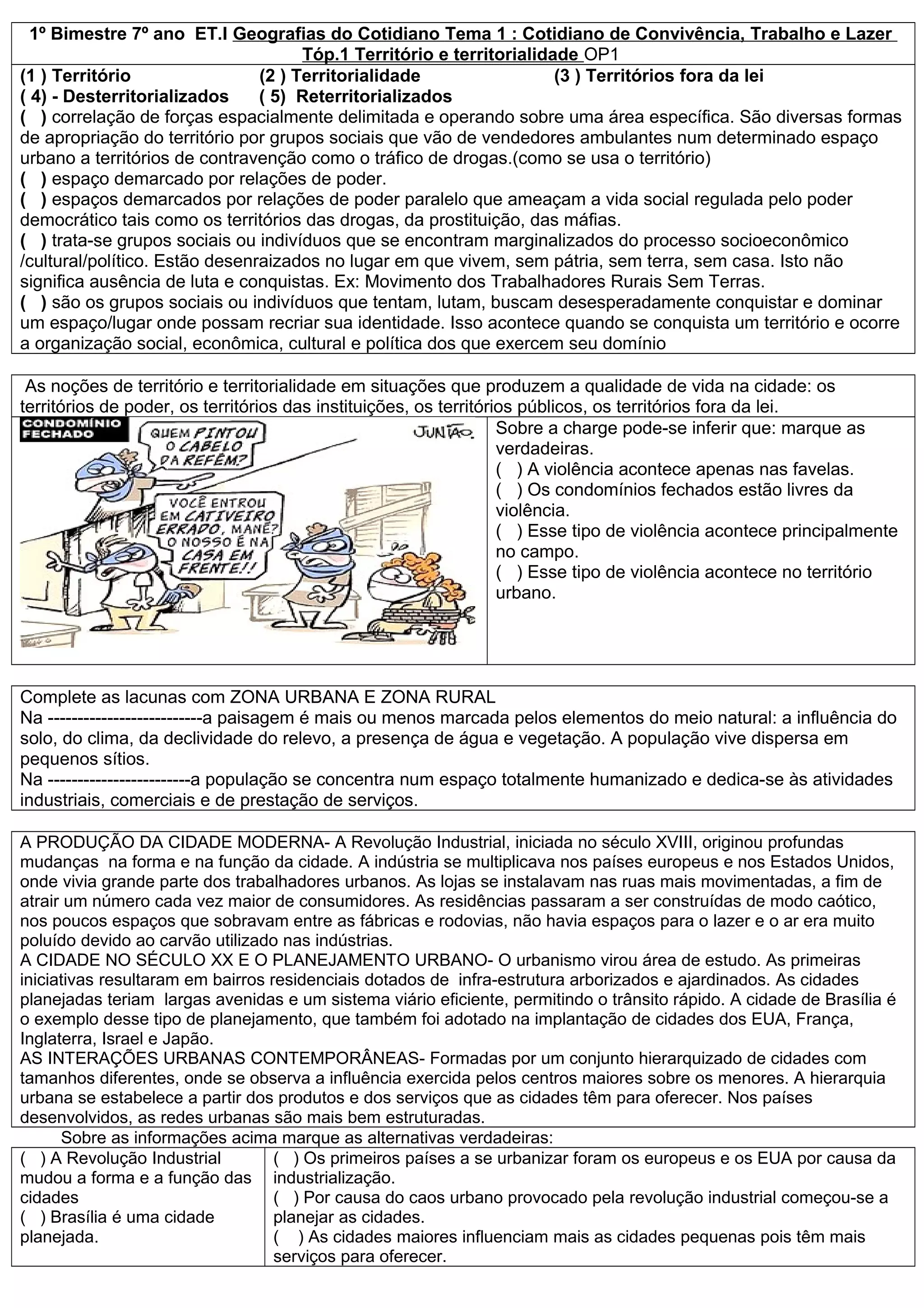 1º Bimestre 7ºano ET.I Geografias do Cotidiano Tema 1 : Cotidiano de Convivência, Trabalho e Lazer
