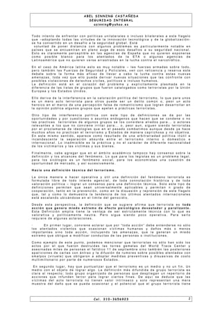 El documento analiza la evolución del terrorismo en Colombia después del 11 de septiembre. Indica que el terrorismo ya no es más que un síntoma del fenómeno creciente de las mafias, que buscan eliminar o reemplazar al poder formal para avanzar sus objetivos a través de una variedad de actividades ilícitas e incluyendo nuevas amenazas como el narcotráfico. El estado actual no tiene la capacidad institucional para enfrentar este fenómeno debido a limitaciones presupuestarias.