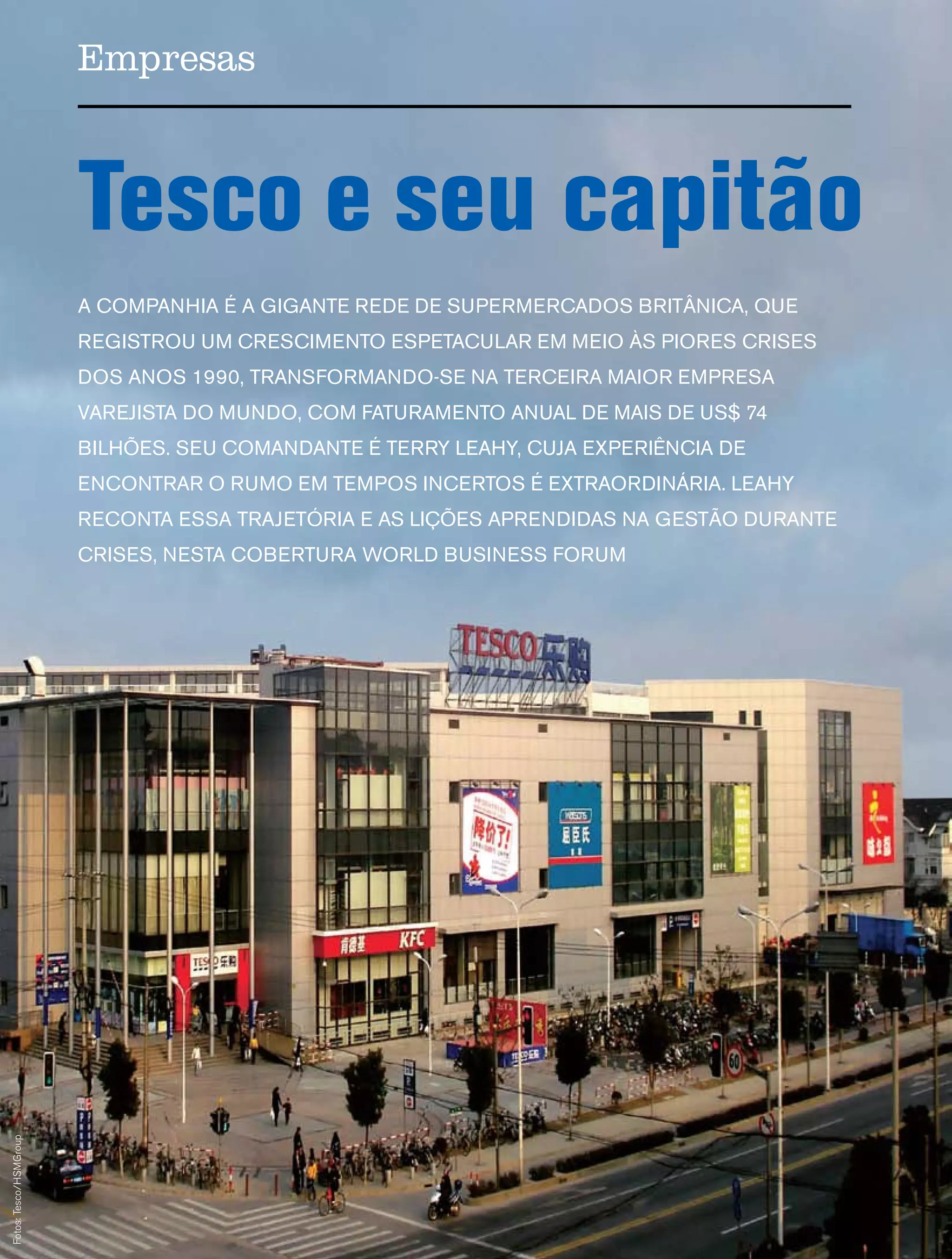 O documento descreve a trajetória de crescimento da rede de supermercados britânica Tesco sob a liderança de Terry Leahy. Sob seu comando, a Tesco quintuplicou o número de lojas, aumentou seu faturamento anual de £14,9 bilhões para £51,8 bilhões e elevou seu lucro antes de impostos de £750 milhões para £2,8 bilhões. Leahy credita esse sucesso ao foco incansável da empresa no cliente, valores de tratar pessoas com respeito e esforço para atendê-las, e