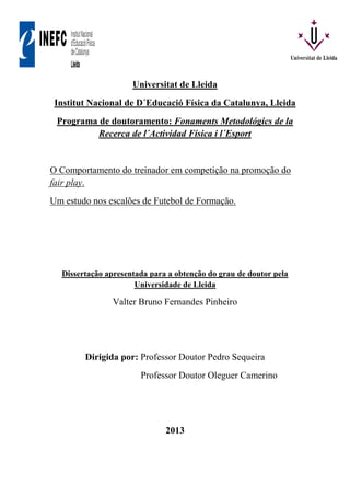 Este documento apresenta uma tese de doutoramento sobre o comportamento do treinador de futebol de formação na promoção do fair play. O estudo observou oito treinadores em competições de futebol de formação e realizou entrevistas. Os resultados demonstraram diferenças no comportamento entre treinadores licenciados e não licenciados em Educação Física.