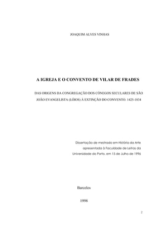 O documento é uma dissertação de mestrado de Joaquim Alves Vinhas que analisa a história da igreja e do convento de Vilar de Frades desde suas origens até sua extinção, abrangendo o período de 1425 a 1834. A pesquisa destaca a importância arquitetônica e artística do convento, bem como as influências dos benfeitores e discussões sobre a autoria das obras. O autor reconhece a colaboração de diversas personalidades e instituições que contribuíram para a realização do trabalho.