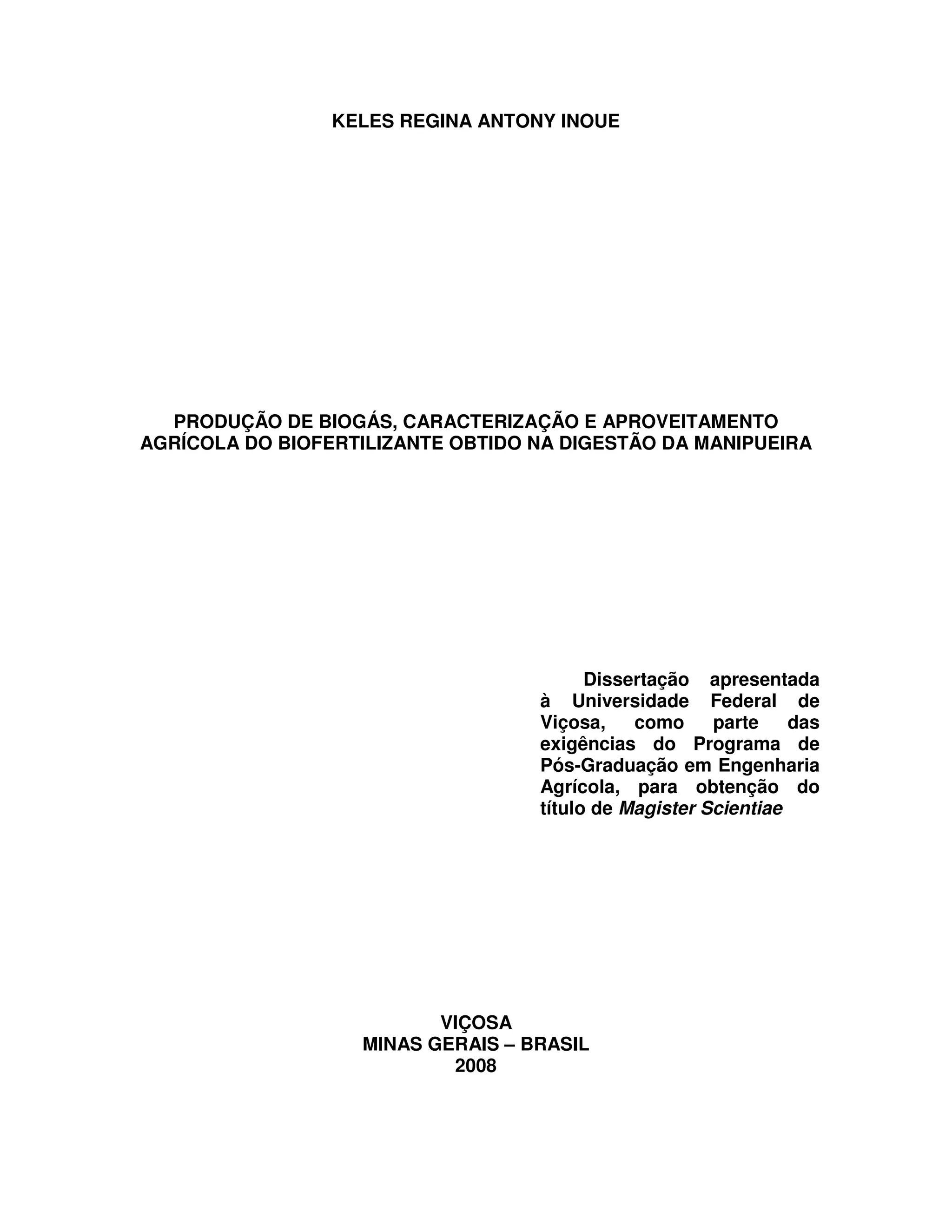 Este documento apresenta uma dissertação de mestrado sobre a produção de biogás a partir da digestão anaeróbia da manipueira, caracterização do biofertilizante gerado e seu aproveitamento agrícola. O trabalho avaliou diferentes concentrações de sólidos totais no processo de digestão e caracterizou o biofertilizante produzido. Além disso, testou a aplicação do biofertilizante em solo cultivado com milho, avaliando parâmetros químicos do solo e nutricionais da planta.