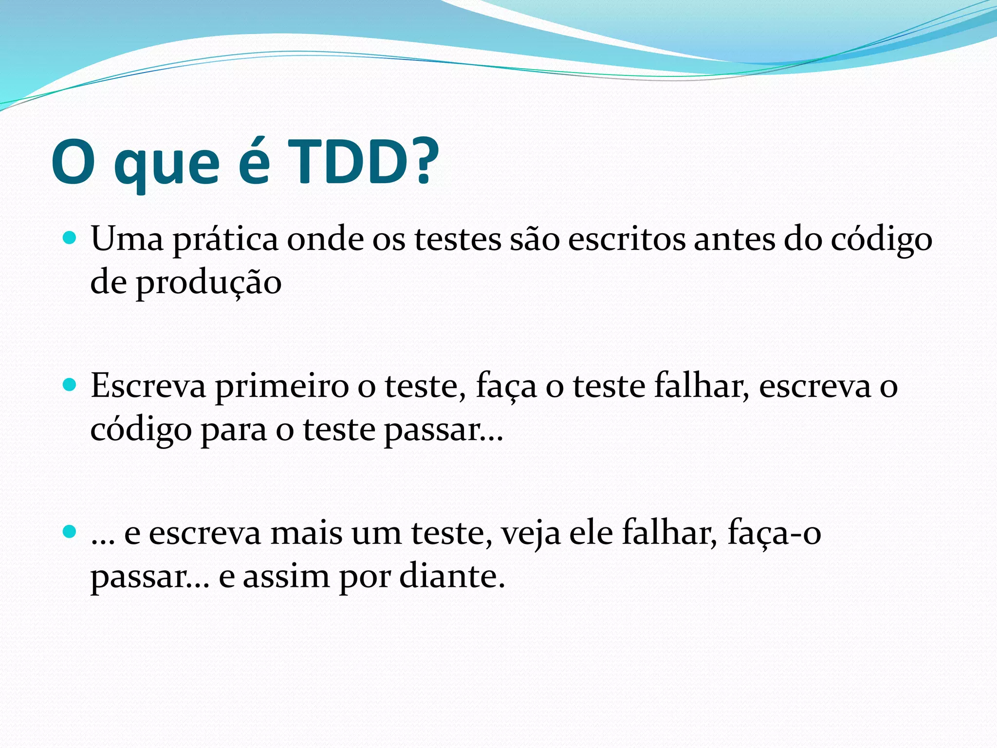 O documento descreve a técnica de desenvolvimento guiado por testes (TDD), onde os testes são escritos antes do código de produção. A prática de TDD promove um design incremental e fornece feedback rápido, melhorando a qualidade do código e do design das classes. As vantagens incluem foco na funcionalidade, aumento da cobertura de testes e código mais robusto após a refatoração.