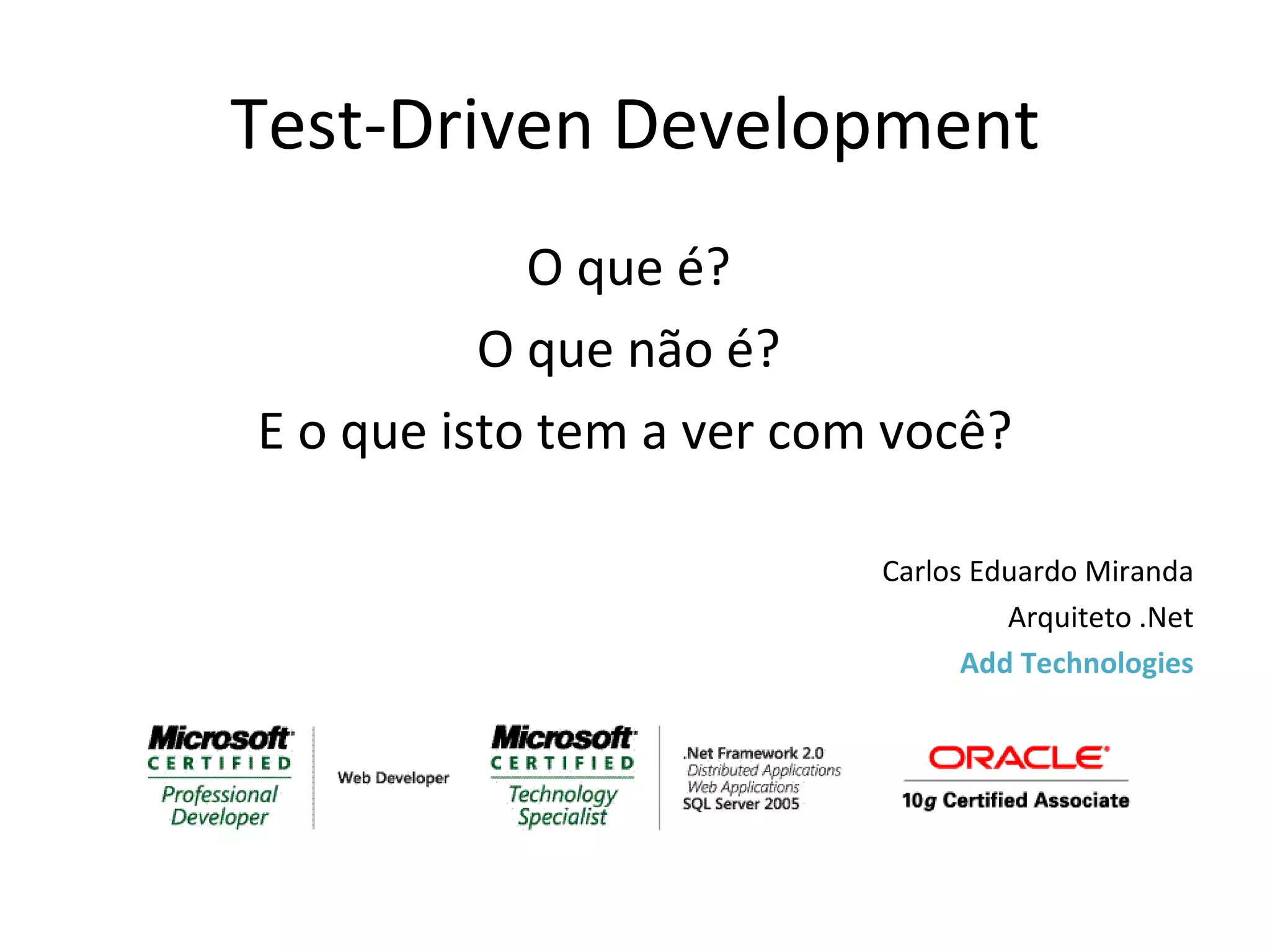 Test-Driven Development Oque é? O que não é? E o que isto tem a ver com você? Carlos Eduardo Miranda Arquiteto .Net Add Technologies