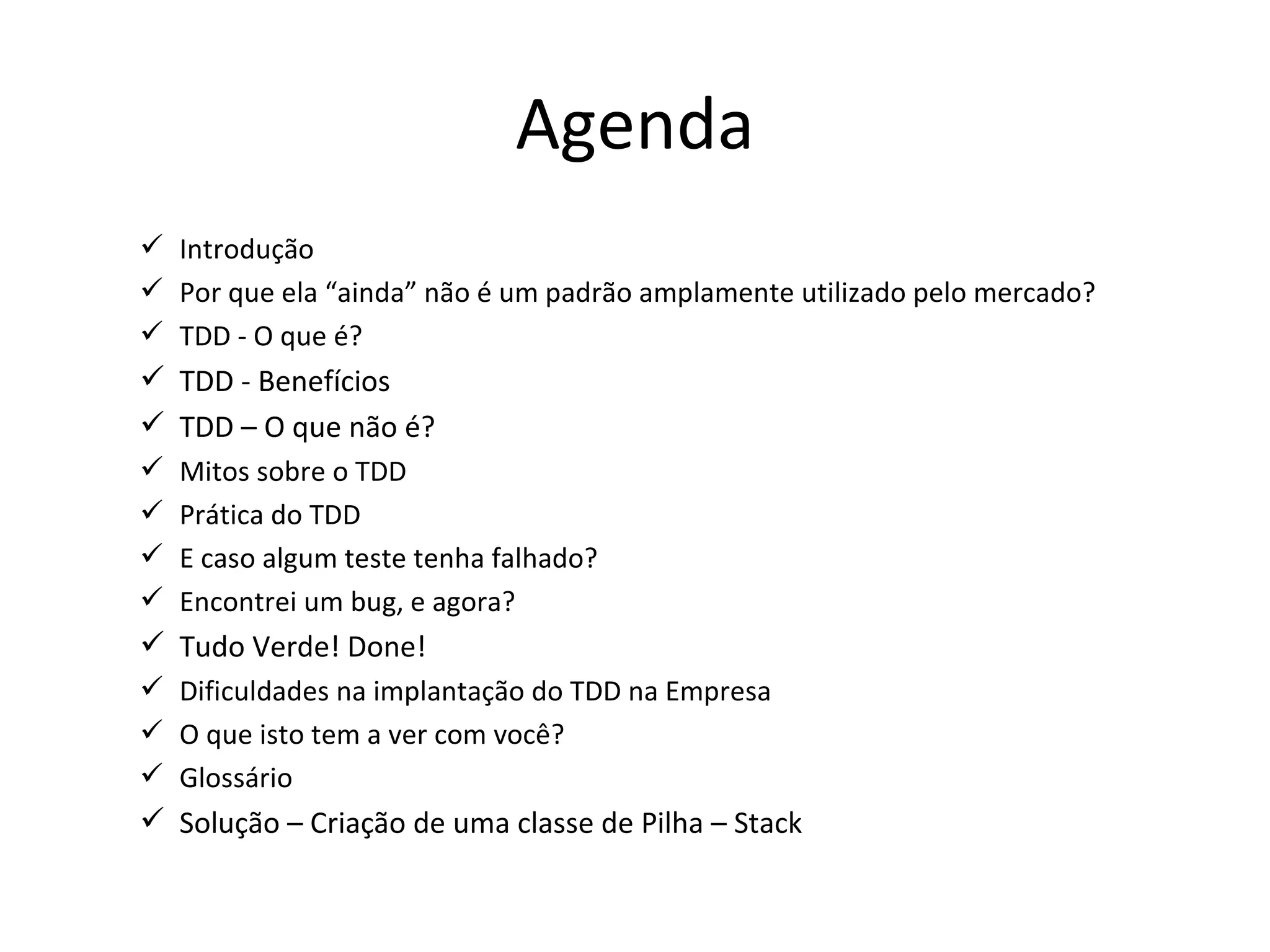 Agenda Introdução Porque ela “ainda” não é um padrão amplamente utilizado pelo mercado? TDD - O que é? TDD - Benefícios TDD – O que não é? Mitos sobre o TDD Prática do TDD E caso algum teste tenha falhado? Encontrei um bug, e agora? Tudo Verde! Done! Dificuldades na implantação do TDD na Empresa O que isto tem a ver com você? Glossário Solução – Criação de uma classe de Pilha – Stack