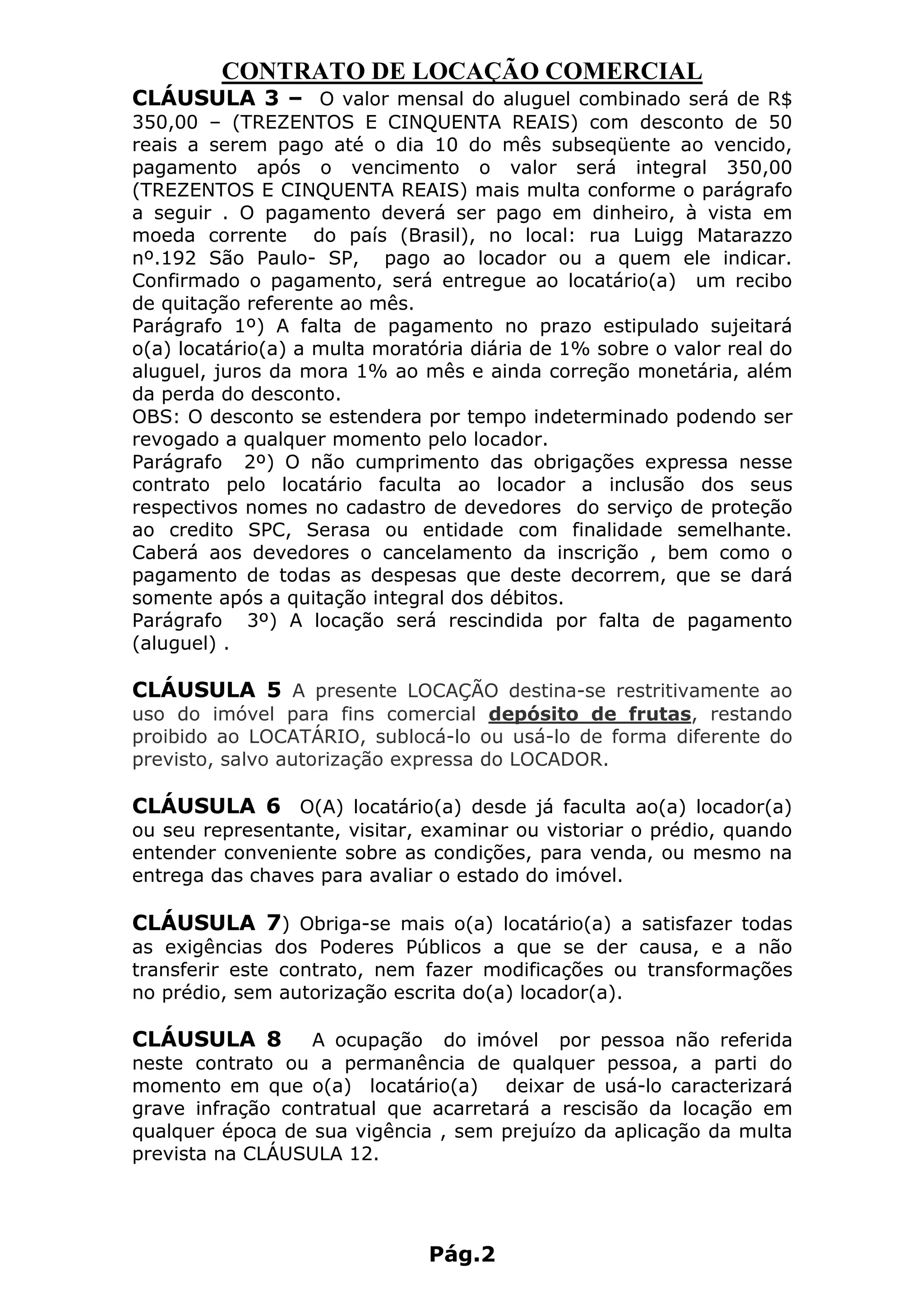 O documento descreve os termos de um contrato de locação comercial, incluindo: o valor do aluguel de R$350 com desconto de R$50 se pago até o dia 10; multas aplicáveis em caso de atraso no pagamento; uso restrito do imóvel para depósito de frutas; e direito de vistoria pelo locador.