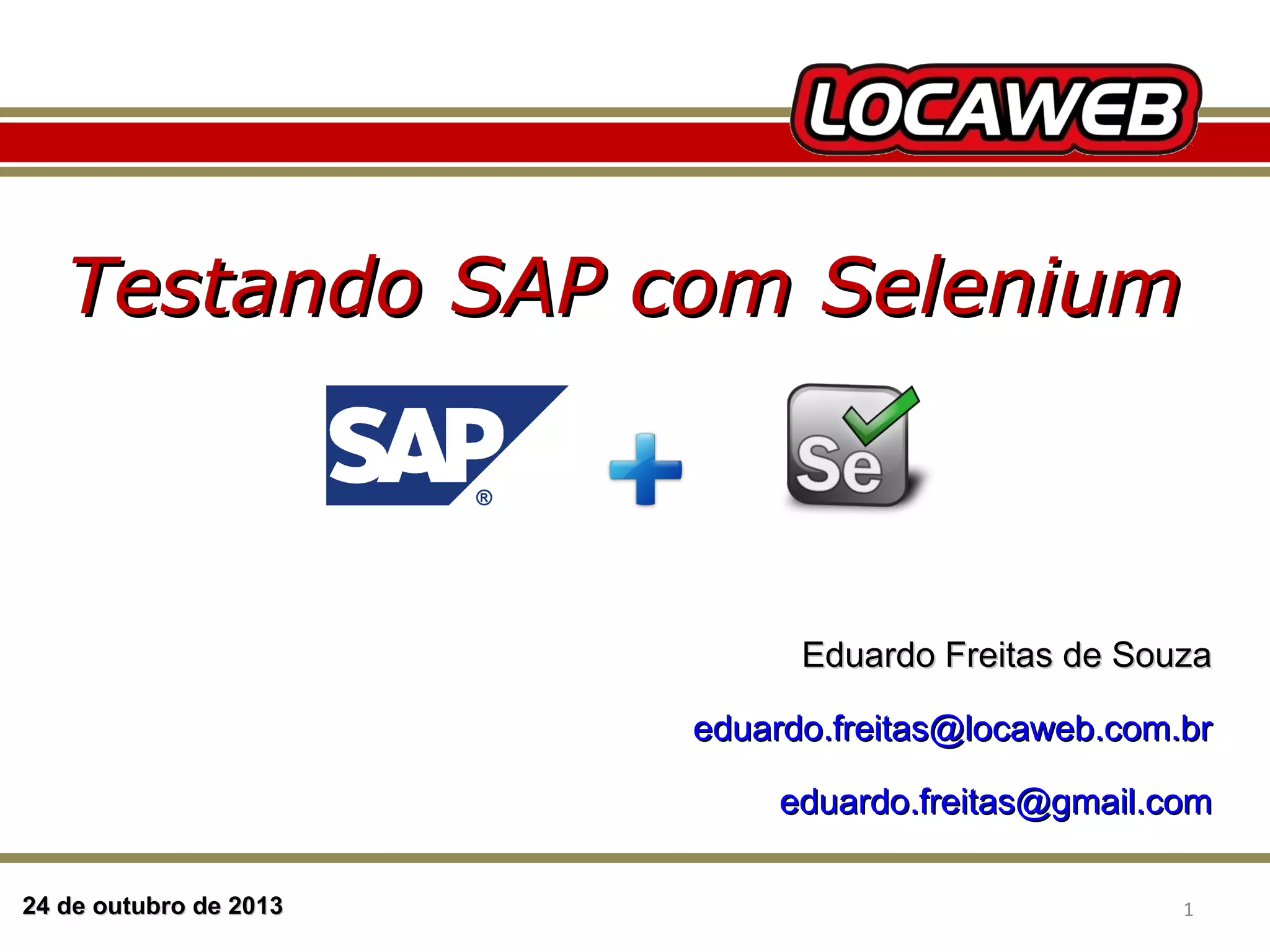 O documento discute a automação de testes do SAP usando Selenium. Ele aborda como configurar o SAP Web, a compatibilidade com Selenium, arquitetura de testes e técnicas.