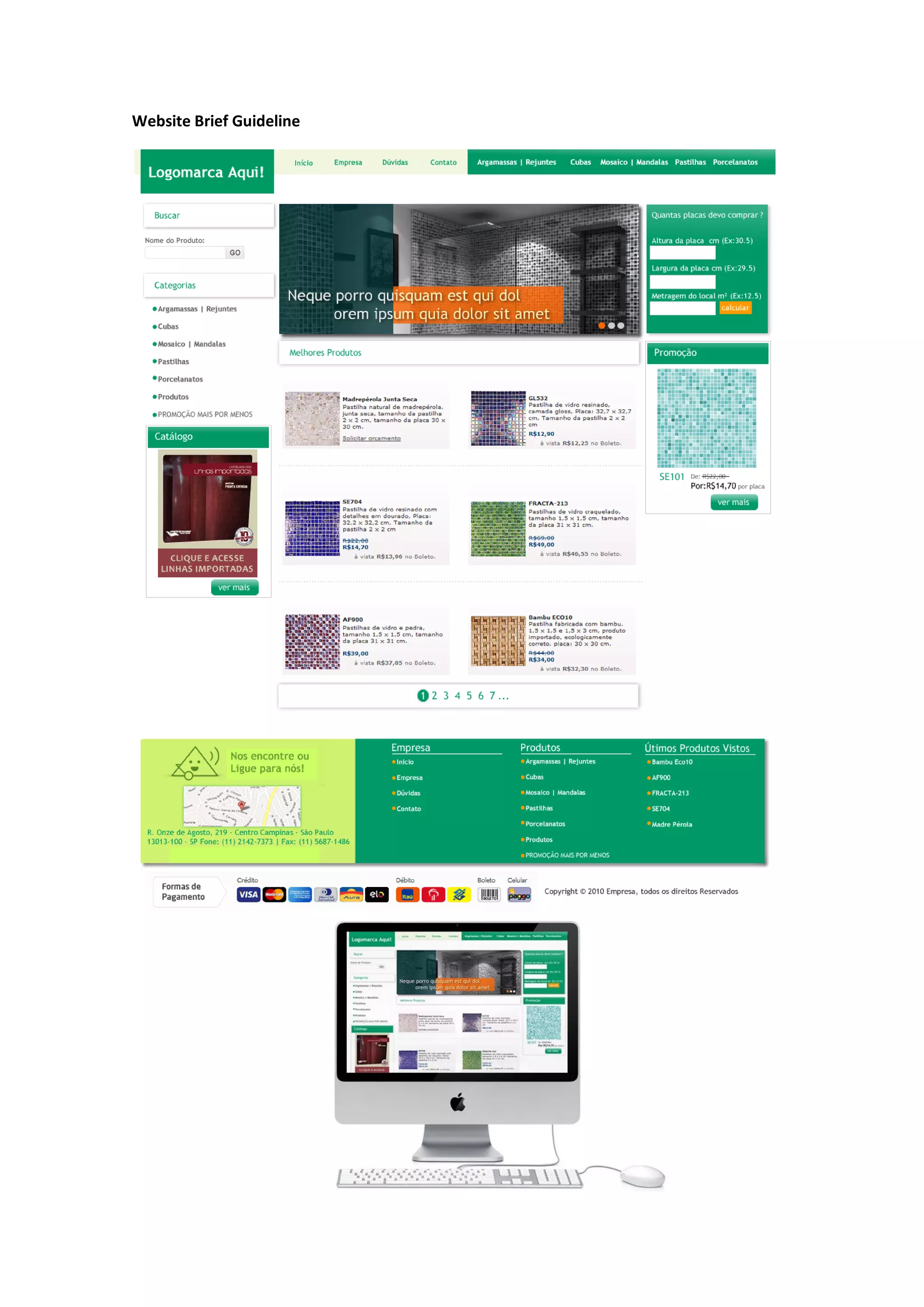 Este documento fornece diretrizes breves para um site e inclui uma cotação para a criação do site por R$500 em 5 parcelas de R$100 cada, serviços de SEO por R$50 e hospedagem por R$25 por mês.