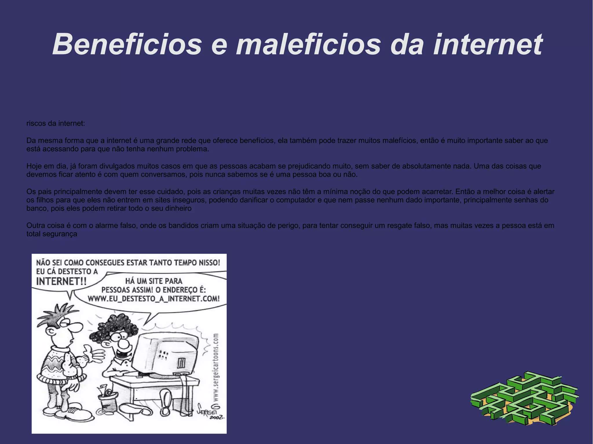 O documento discute os riscos e benefícios da internet. Entre os riscos estão a exposição a conteúdo impróprio, violência, roubo de dados pessoais e encontros perigosos online. Os pais devem alertar as crianças sobre esses perigos e orientá-las a evitar sites inseguros e não fornecer informações pessoais.