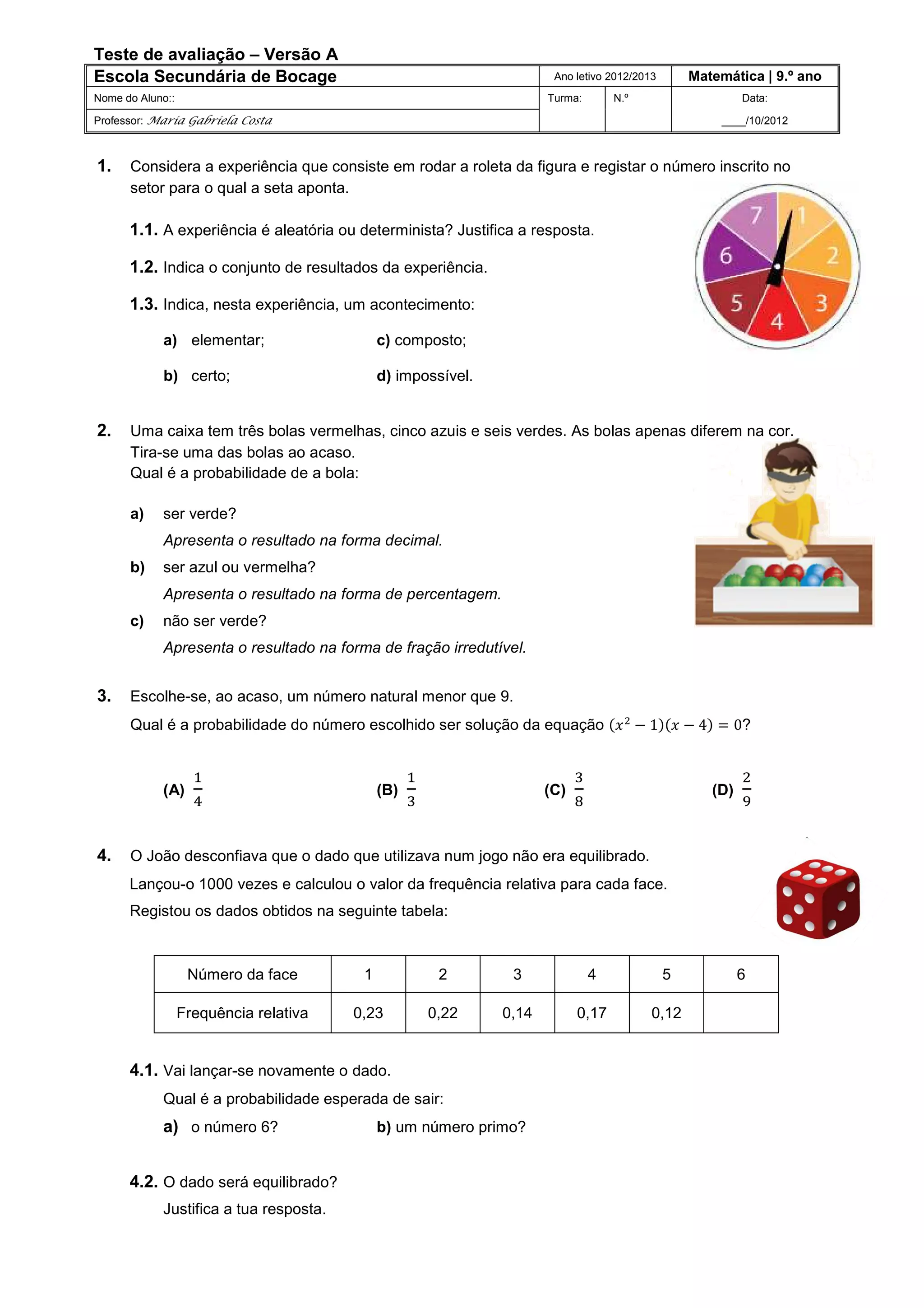 Este documento apresenta um teste de avaliação de matemática do 9o ano com 12 questões sobre probabilidade e estatística. As questões abordam tópicos como experiências aleatórias, espaços amostras, probabilidades, diagramas de Venn, lançamento de dados e distribuição aleatória de itens. O teste avalia a compreensão dos conceitos básicos de probabilidade e a habilidade de cálculo de probabilidades.