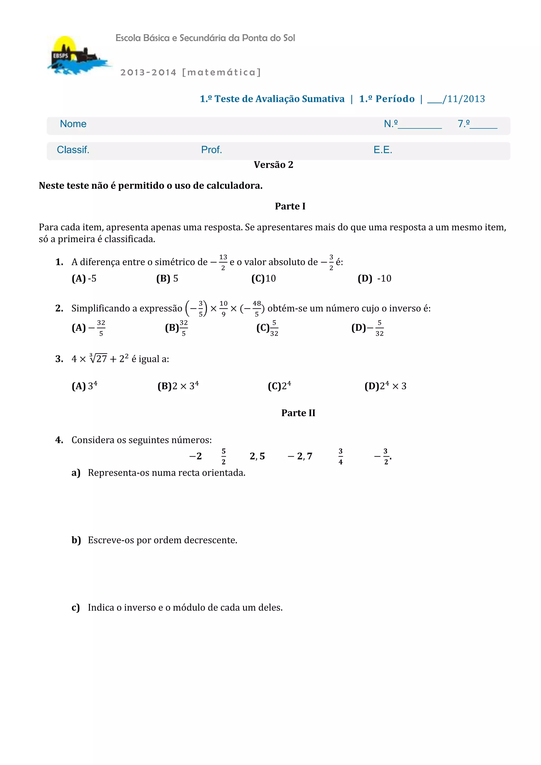 O teste de matemática avalia conceitos como números negativos, operações com frações, propriedades de igualdades e resolução de problemas. As questões incluem representar números na reta numérica, ordenar números por ordem decrescente, calcular expressões algébricas e determinar propriedades de figuras geométricas como cubos e terrenos.
