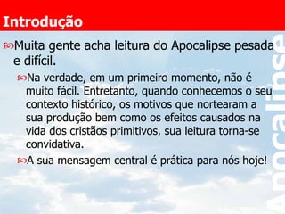 O documento apresenta uma introdução sobre a literatura apocalíptica na Bíblia, incluindo livros como Daniel e Zacarias no Antigo Testamento. Discute que o Apocalipse de João é o livro mais completo do gênero, abrangendo não só Israel mas a Igreja universal. A mensagem central é a revelação de Jesus Cristo como o Alfa e Ômega que ama a humanidade e a liberta dos pecados.