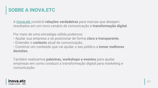 A agência de comunicação inova.etc oferece serviços de marketing de conteúdo, relações públicas, estratégias digitais e análise de dados para ajudar marcas a se posicionarem claramente e se comunicarem de forma consistente através de múltiplos canais. A agência também realiza treinamentos para empresas sobre inovação em comunicação e transformação digital.
