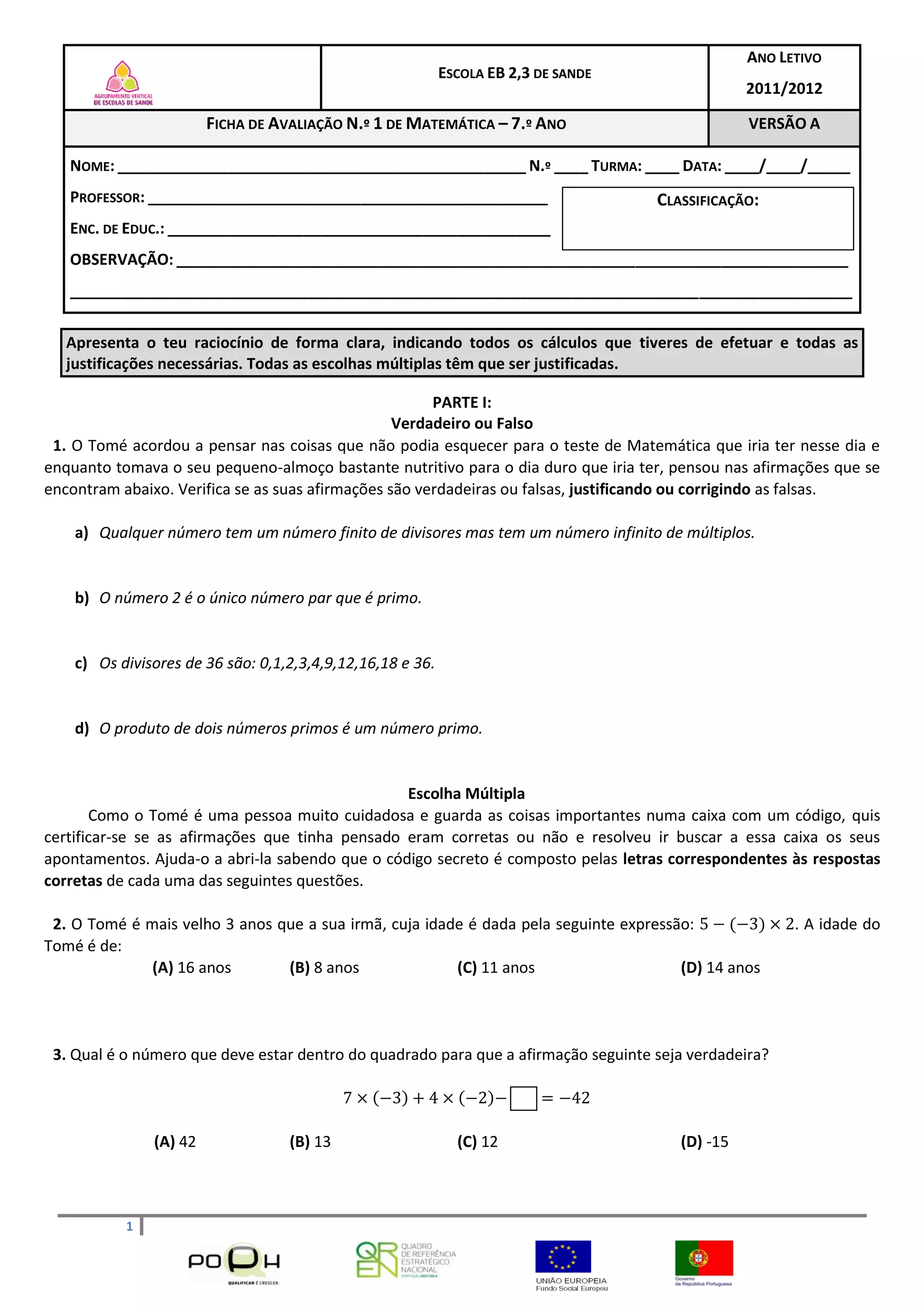 FICHA DE AVALIAÇÃO N.º 1 DE MATEMÁTICA – 7.º ANO VERSÃO A