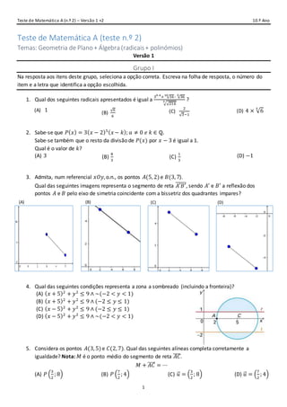 O documento é um teste de matemática para o 10.o ano, abordando temas de geometria e álgebra, incluindo radicais e polinômios. Ele é dividido em dois grupos, com questões de escolha múltipla e desenvolvimento, requerendo cálculos e justificativas para as respostas do grupo II. O teste inclui problemas sobre interseções de circunferências e eixos, reflexões em eixos de simetria, e propriedades de polinômios.
