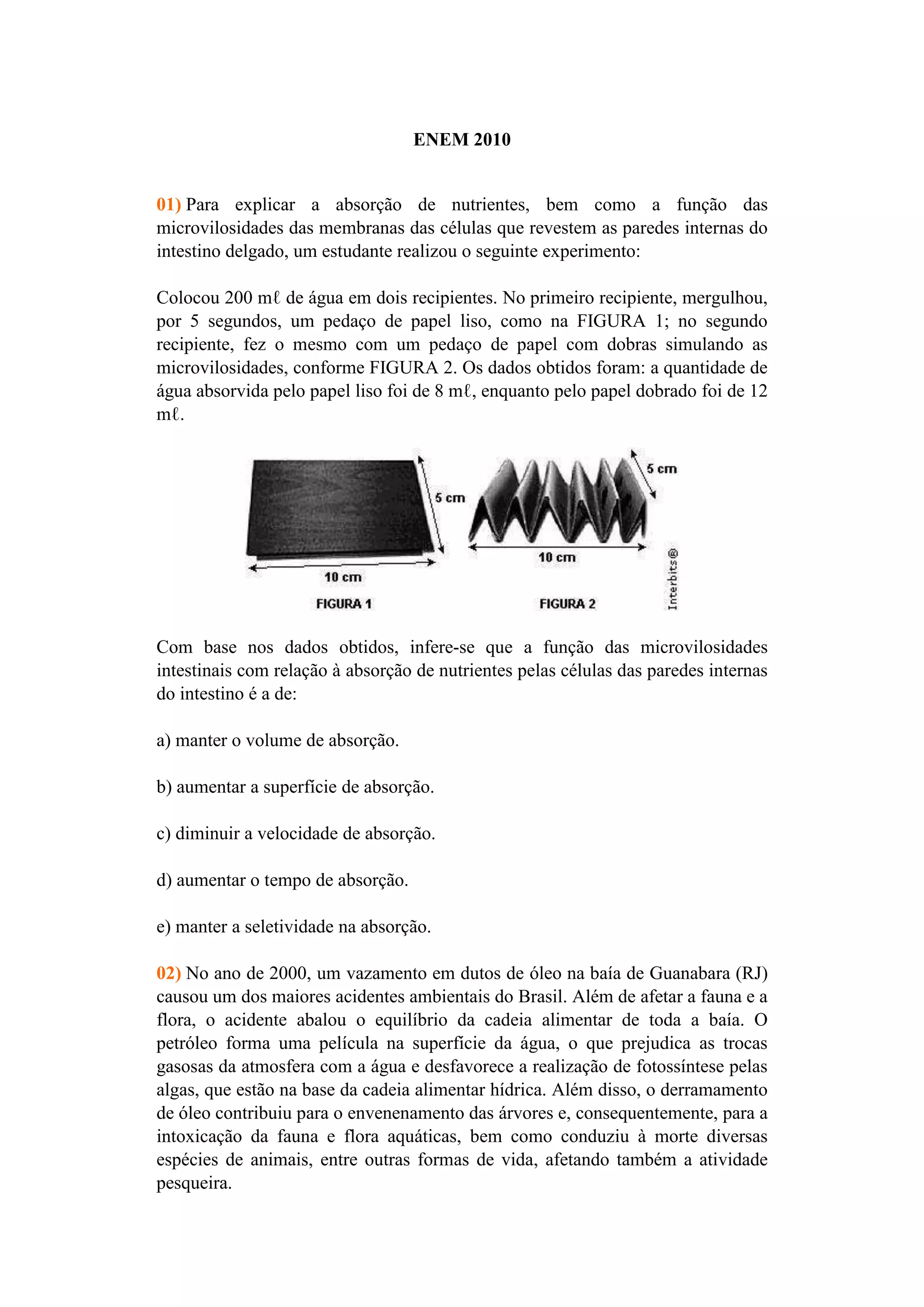 O documento descreve um experimento sobre a função das microvilosidades intestinais na absorção de nutrientes, que aumentam a superfície de absorção, permitindo que mais água seja absorvida por um pedaço de papel dobrado em comparação com um pedaço de papel liso.