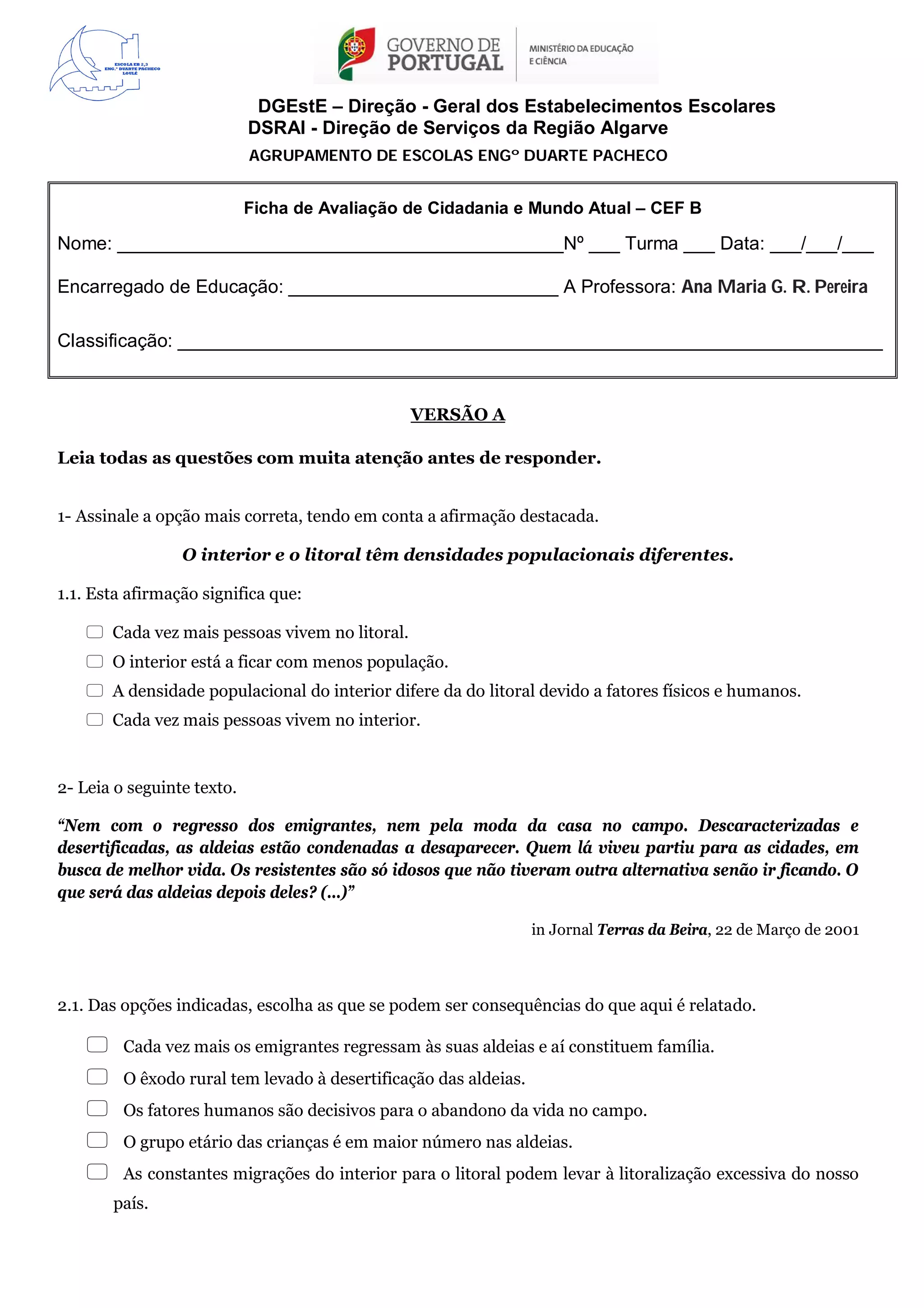 Este documento é uma avaliação de cidadania e mundo atual para alunos do ensino básico. Contém perguntas sobre temas como êxodo rural, urbanização, tipos de plantas urbanas e funções das cidades. As respostas devem ser assinaladas com opções múltiplas ou por completar frases.