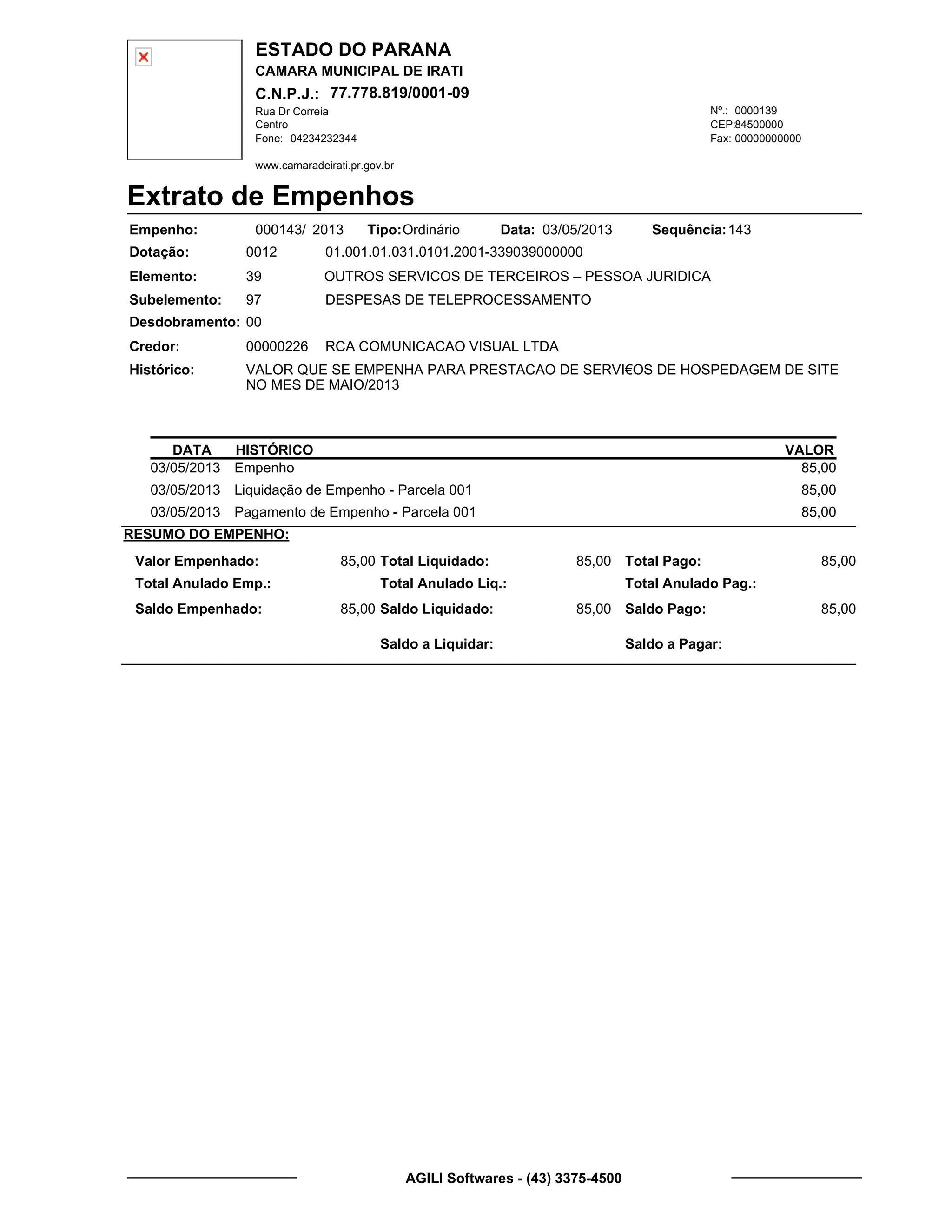 O documento lista 10 empenhos realizados pela Câmara Municipal de Irati no mês de maio de 2013 para pagamentos de serviços como hospedagem de site, serviços notariais, diárias de vereador, água mineral, telefonia fixa, internet e energia elétrica, totalizando valores empenhados de R$2,517.80.
