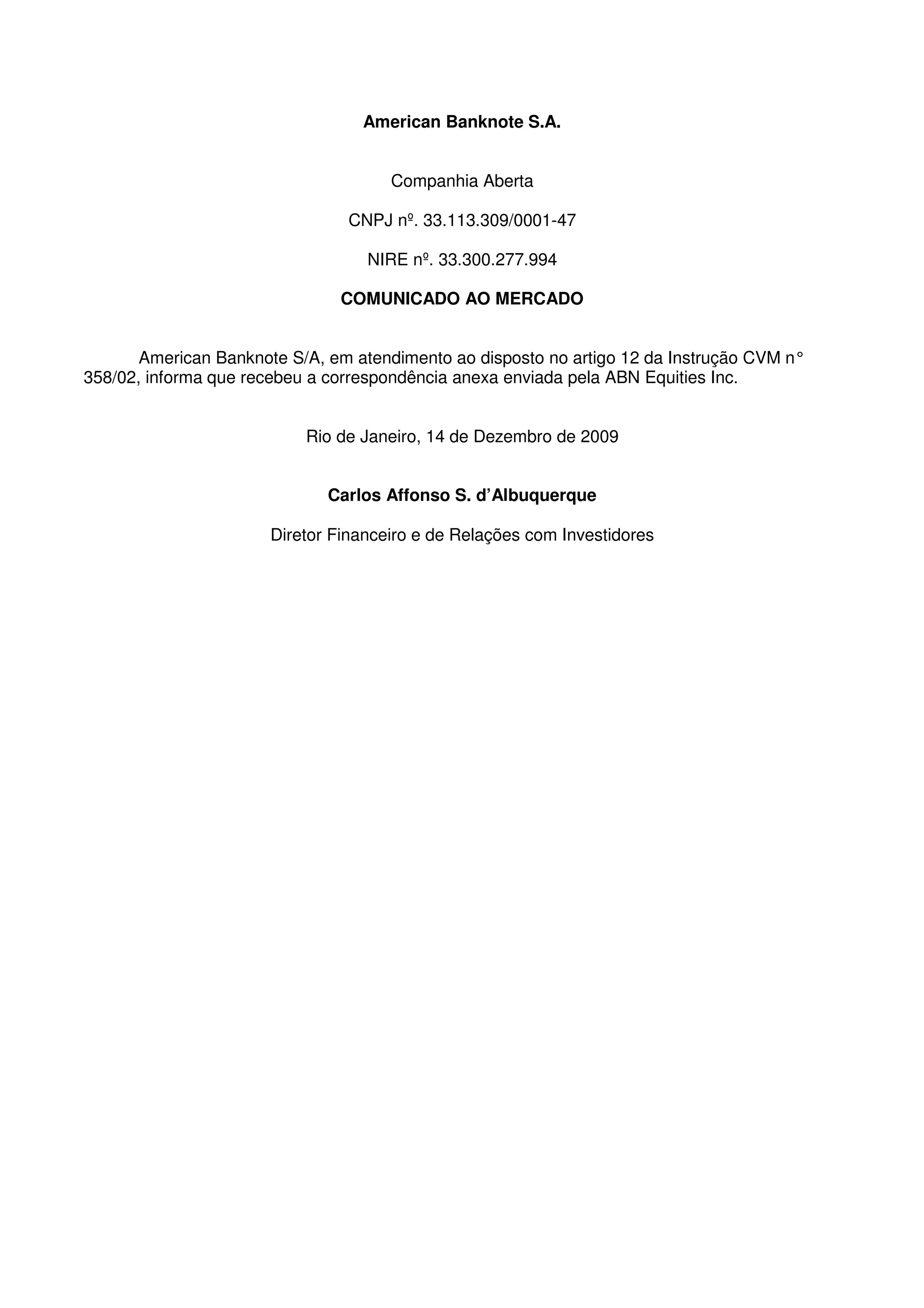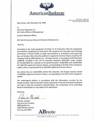 O documento informa que a ABN Equities Inc., investidor estrangeiro, reduziu sua posição acionária na American Banknote S.A. de 22,33% para 10,42% do capital social entre novembro e dezembro de 2009, sem intenção de alterar o controle ou administração da companhia.