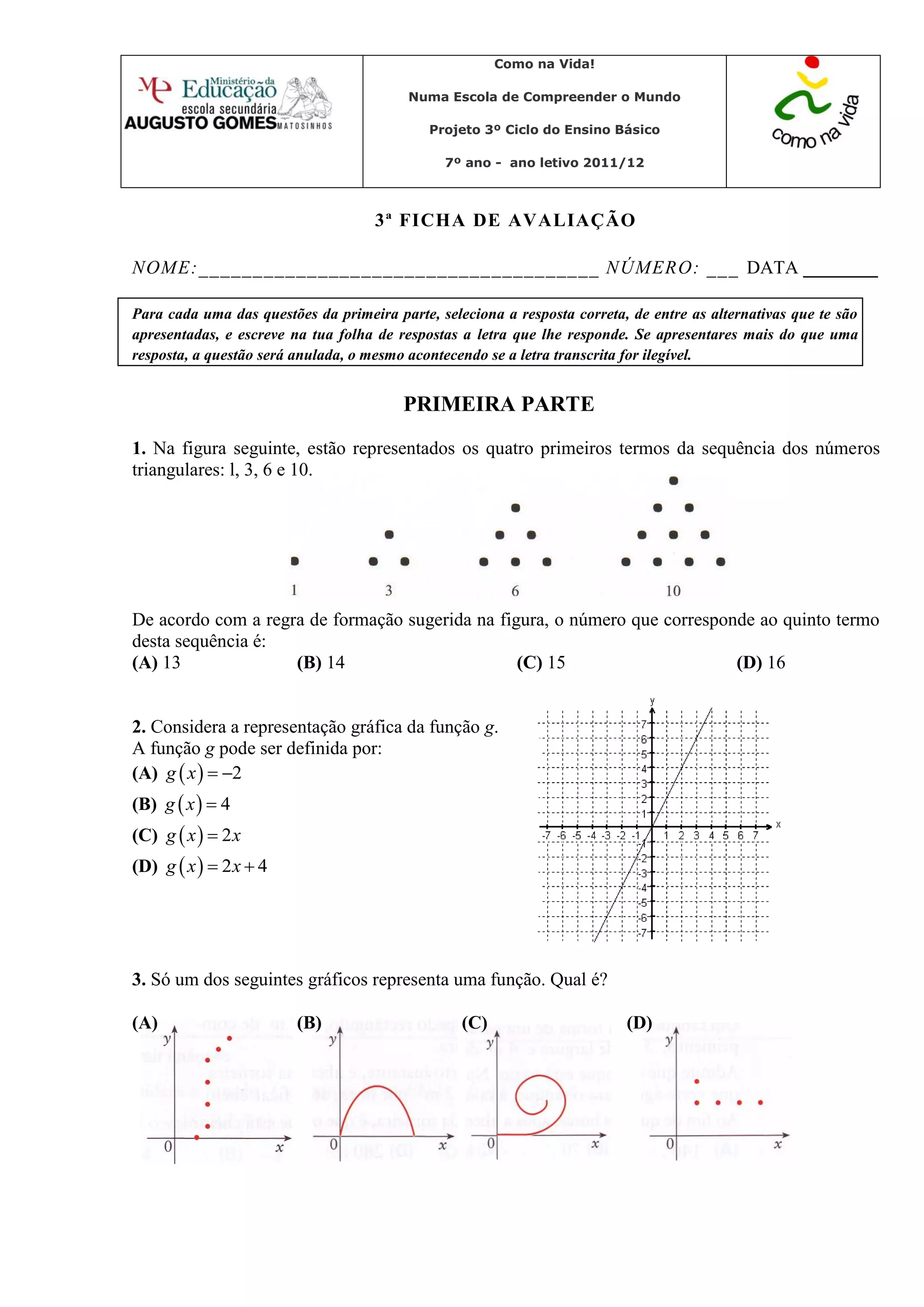 Este documento apresenta uma avaliação de matemática para alunos do 7o ano, contendo 9 questões na primeira parte e 9 questões na segunda parte. A avaliação cobre tópicos como sequências numéricas, funções, proporcionalidade direta, sistemas de coordenadas cartesianas e representação gráfica de funções.