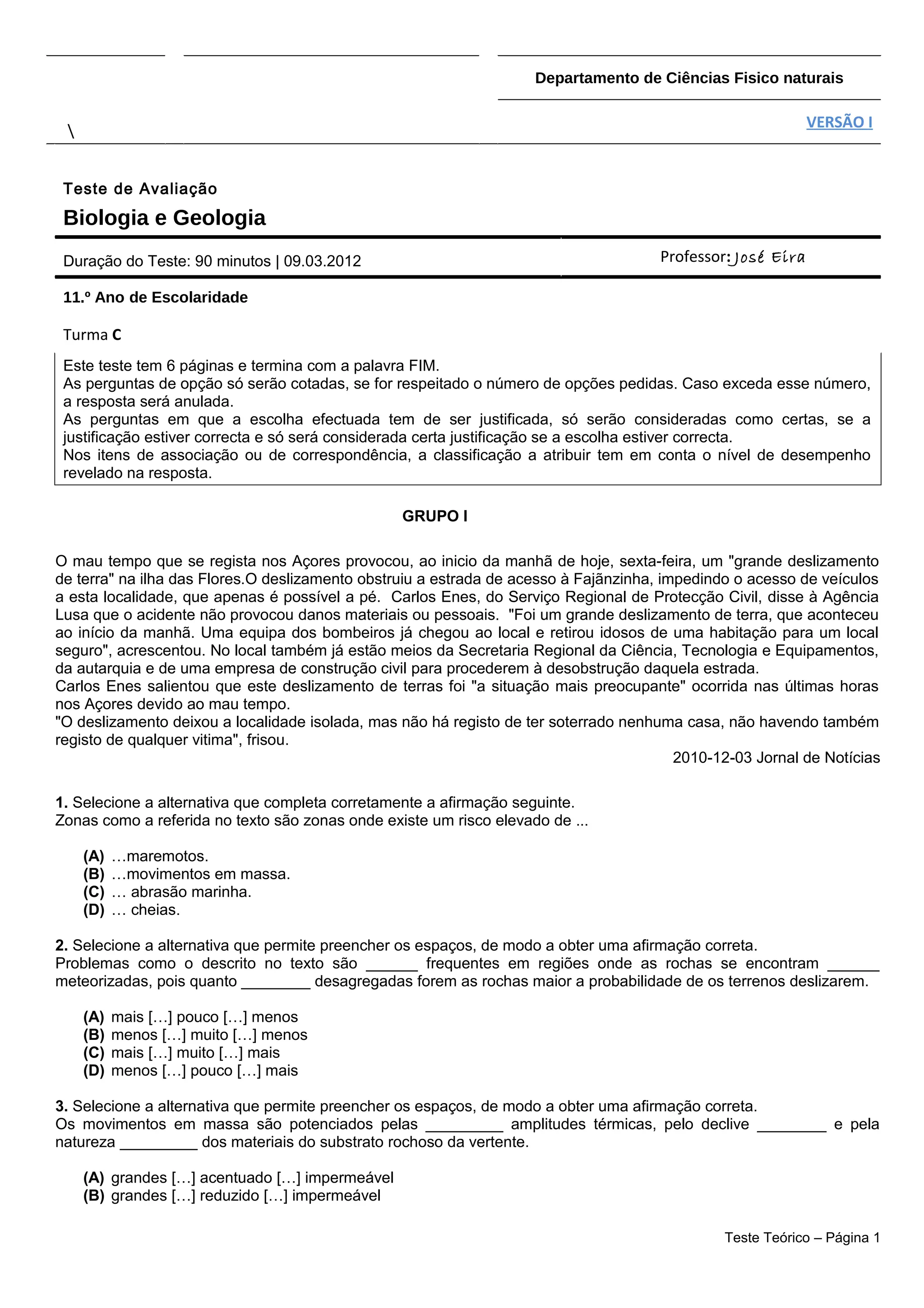 Este documento é um teste de avaliação de Biologia e Geologia para o 11o ano com 6 páginas. Contém perguntas sobre um deslizamento de terra nos Açores, geomorfologia de regiões calcárias, impactos ambientais de barragens e estruturas sedimentares.