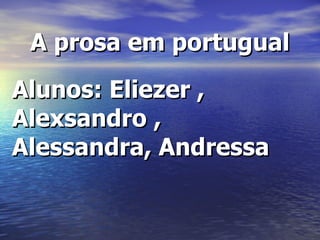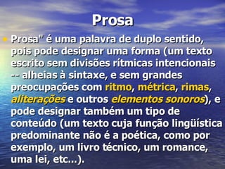 Este documento discute a prosa e seus subgêneros. Define prosa como um texto escrito sem preocupações com ritmo ou métrica, e contrasta-o com poesia. A prosa poética é definida como um texto em prosa cuja função principal é poética. O documento lista alguns expoentes da prosa poética e divide a prosa em três subgêneros: romance, conto e novela.