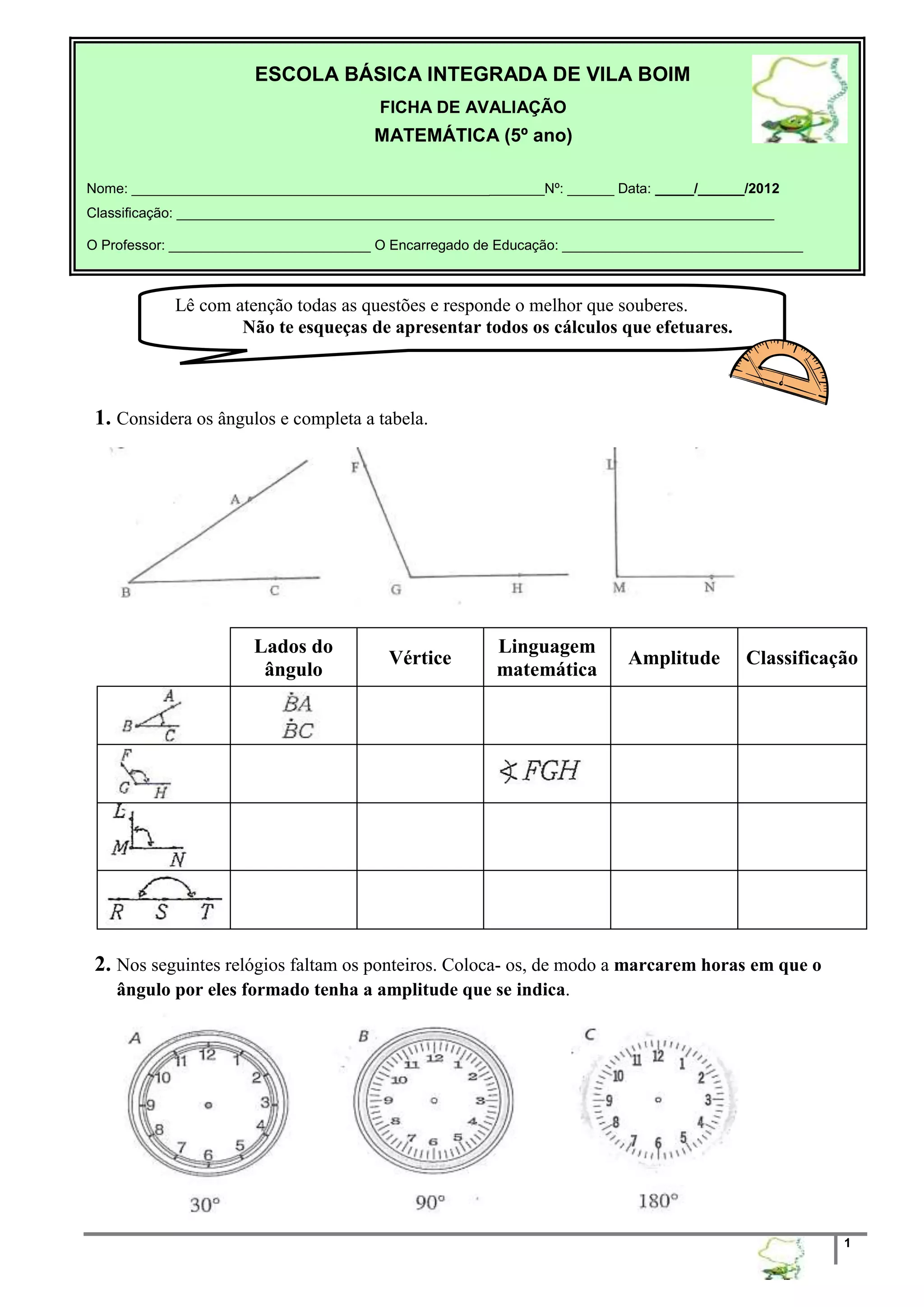 1. O documento contém uma ficha de avaliação de matemática para o 5o ano com 11 questões sobre ângulos, triângulos e suas propriedades.